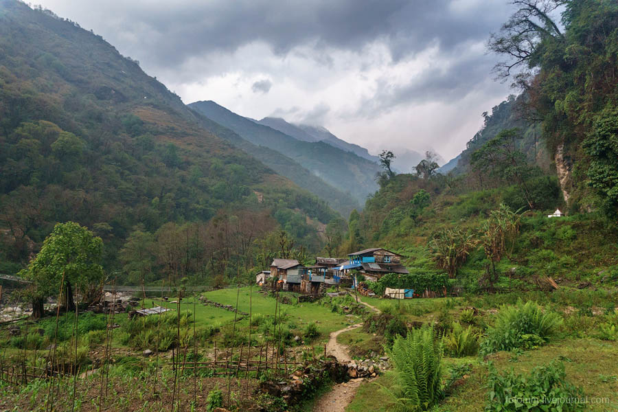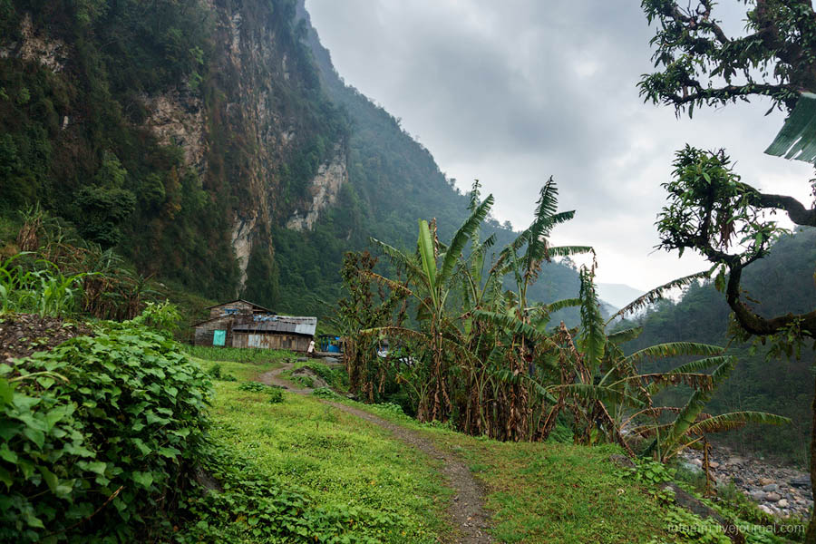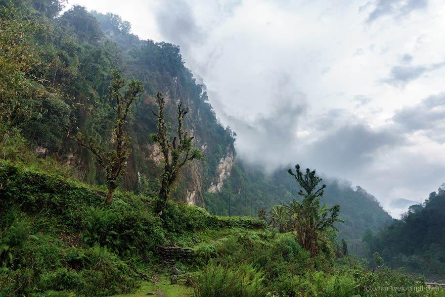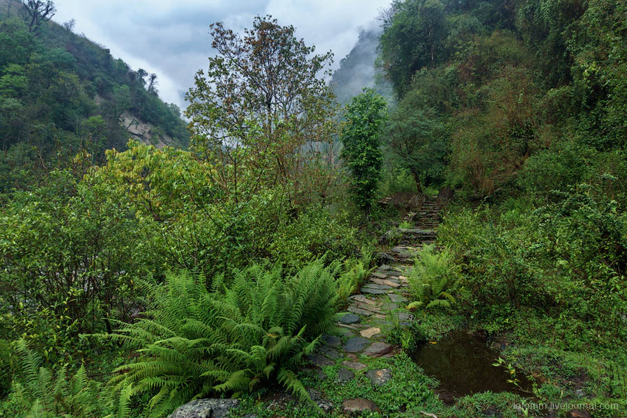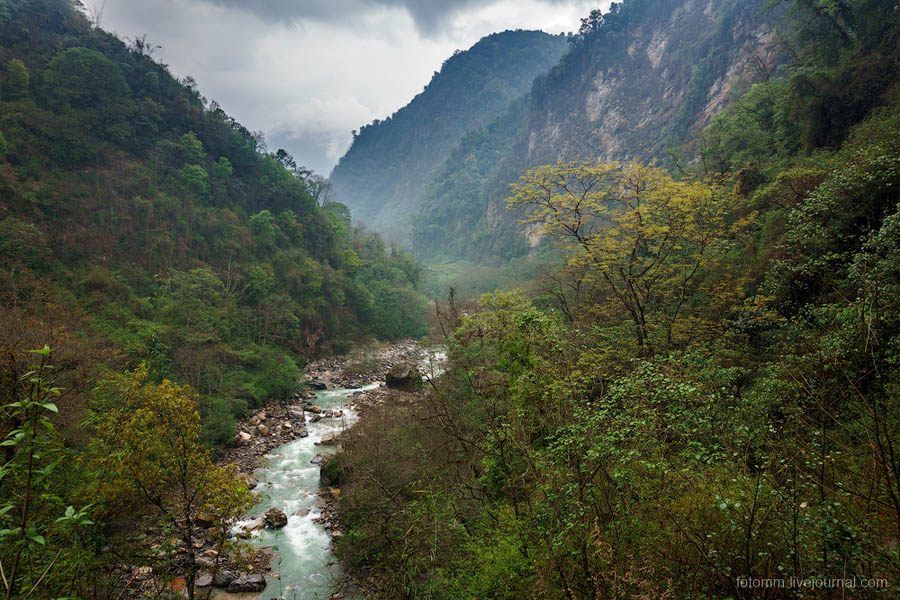 На противоположном берегу реки тоже тропа и я вижу как по ней идут два шерпа и тащат на спине корзины с грузом. Я подумал, возможно этим путем я буду возвращаться через неделю. Но не сбылось...