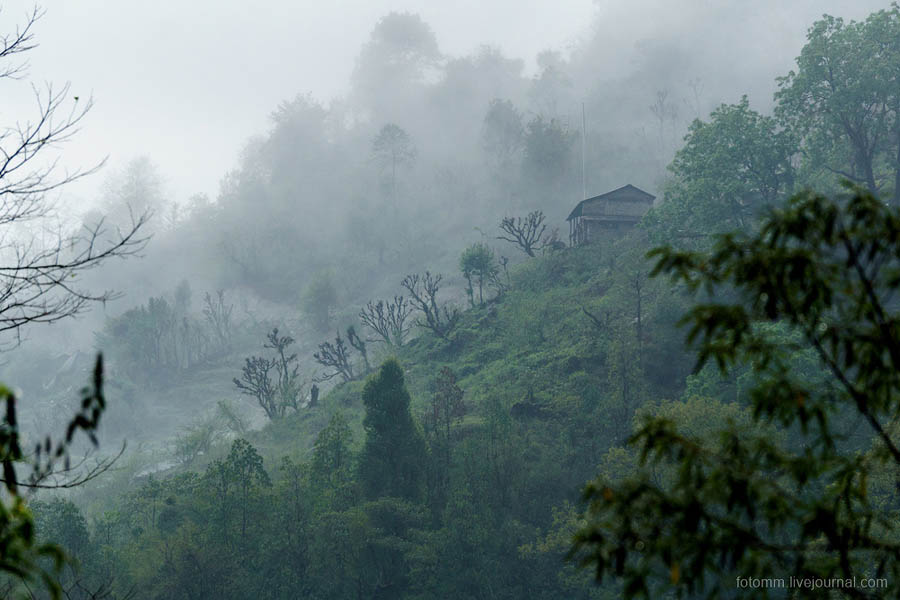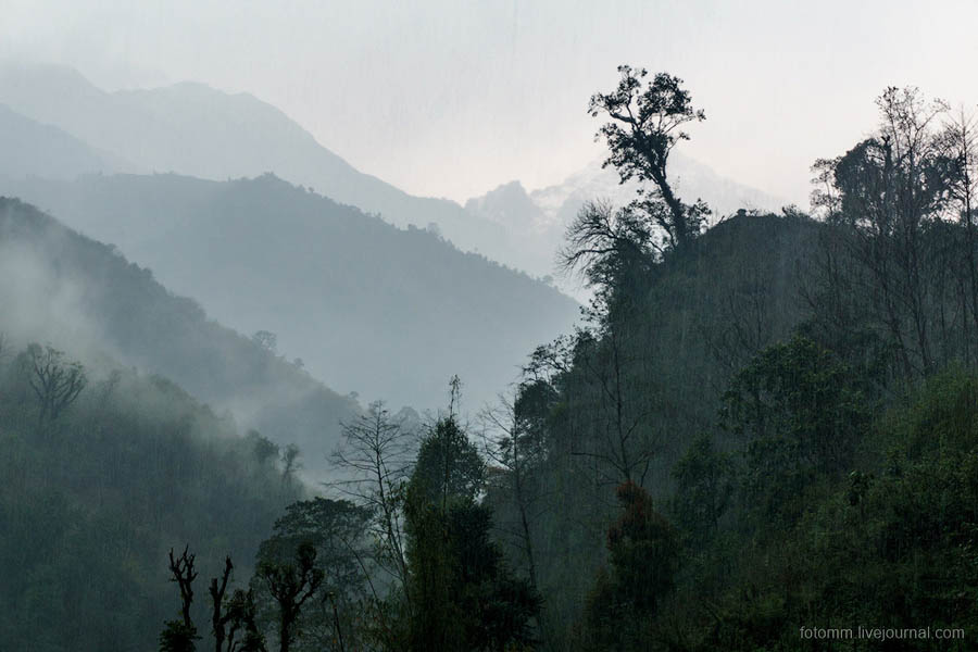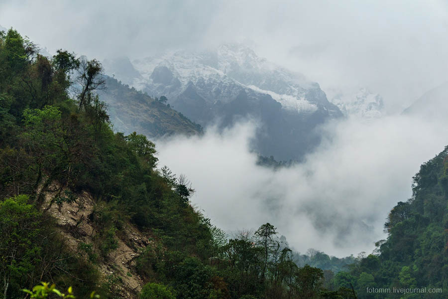 Иногда туман рассеивался и над долиной появлялись склоны горы, усыпанные снегом.
