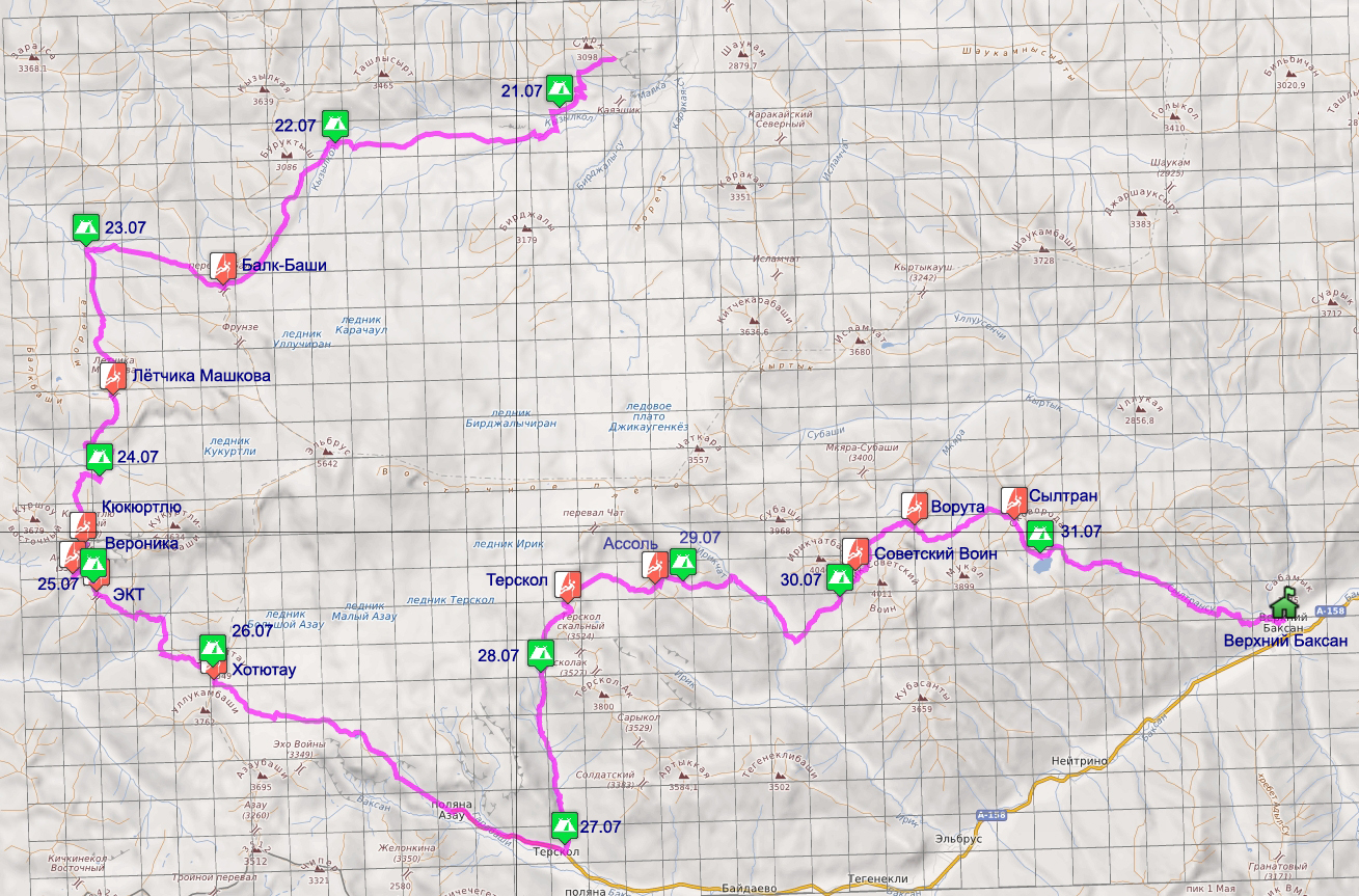 Протяжённость: 112.59 км Нитка похода заявленная. кур. Джилы-Су - поляна Эммануэля - пер. Балкбаши (1А, 3691) – д.р. Битюктюбе - пер. Летчика Машкова (1А, 3500) – лед. Кюкюртлю - пер. КюкюртлюЮжн. (1А, 3690) + пер. Вероника (Акбаши) + пер. ЭКТ (3400, 1Б) - д.р. Уллукам - пер. Хотютау (1Б, 3500) - Эльбрусское озеро.- пос.Терскол - пер. Терскол (1Б, 3620) – лед. Ирик - пер. Ассоль (1Б, 3630) - д.р. Ирикчат - пер. Ирик Вост. (Советский Воин) (1Б, 3760) + пер. Ворута (1А, 3350) - д.р. Мукал - пер. Сылтран (н/к, 3500) – р. Сылтран-су - В. Баксан Запасные и аварийные варианты пути. Вместо пер. Летчика Машкова - пер. Кольцевой или обход по долинам Битюктюбе и Уллухурзук. Вместо связки пер. ЭКТ + Вероника - спуск по р. Акбаши в д.р. Уллукам, или вместо пер. ЭКТ - спуск в Уллукам по долине Актерек. Вместо пер. Терскол - пер. Терсколак. Вместо пер. Ассоль - обход долинами рек Ирик и Ирикчат. Вместо пер. Ворута - обход долинами Мкяра и Мукал. Вместо пер. Сылтран - спуск по долине Кыртык. При нехватке времени на прохождение перевалов ИрикВост, Ворута и Сылтран - радиальное восхождение на в. Чаткара и спуск в пос. Эльбрус по долине Ирикчат. При аварийном варианте возможен спуск долинами всех рек до автомобильной дороги. Нитка похода пройденная. поляна Эммануэля - пер. Балкбаши (1А, 3691) – д.р. Битюктюбе - пер. Летчика Машкова (1А, 3500) – лед. Кюкюртлю - пер. КюкюртлюЮжн. (1А, 3690) + пер. Вероника (Акбаши) + пер. ЭКТ (3400, 1Б) - д.р. Уллукам - пер. Хотютау (1Б, 3500) - Эльбрусское озеро.- пос.Терскол - пер. Терскол (1Б, 3620) – лед. Ирик - пер. Ассоль (1Б, 3630) - д.р. Ирикчат - пер. Ирик Вост. (Советский Воин) (1Б, 3760) + пер. Ворута (1А, 3350) - д.р. Мукал - пер. Сылтран (н/к, 3500) – р. Сылтран-су - В. Баксан Изменения маршрута и их причины. В связи с ожиданием одного участника из группы В. Рогова, опоздавшего на самолет, пришлось задержаться в МинВодах до второй половины дня. Чтобы сразу не выбиться из графика, изменили точку старта и заехали не на курорт Джилы-Су, а сразу на поляну Эммануэля, к Белому Нарзану. По этой же причине, отказались от радиального выхода в день заезда - на него просто не осталось времени, на точку старта мы приехали уже в сумерках. На четвертый день маршрута мы на несколько переходов отстали от графика, ожидая группу В. Рогова, взаимодействие с которой на этом этапе было для нас обязательным (указание МКК). Это оказалось даже к лучшему, так как на запланированном месте ночевки, по наблюдениям следующего дня, не оказалось воды. Кроме того, это позволило нам на 5 день провести ночевку на высоте 3500 (пер. Хотютау), что было хорошо для акклиматизации и получения высотного опыта группы. Этот вариант рассматривался еще в Москве, хотя и не считался основным. Специально для этого в график был заложен 1 запасной день, который мы и потратили. Весь остальной маршрут был пройден полностью, в срок и без изменений. График движения