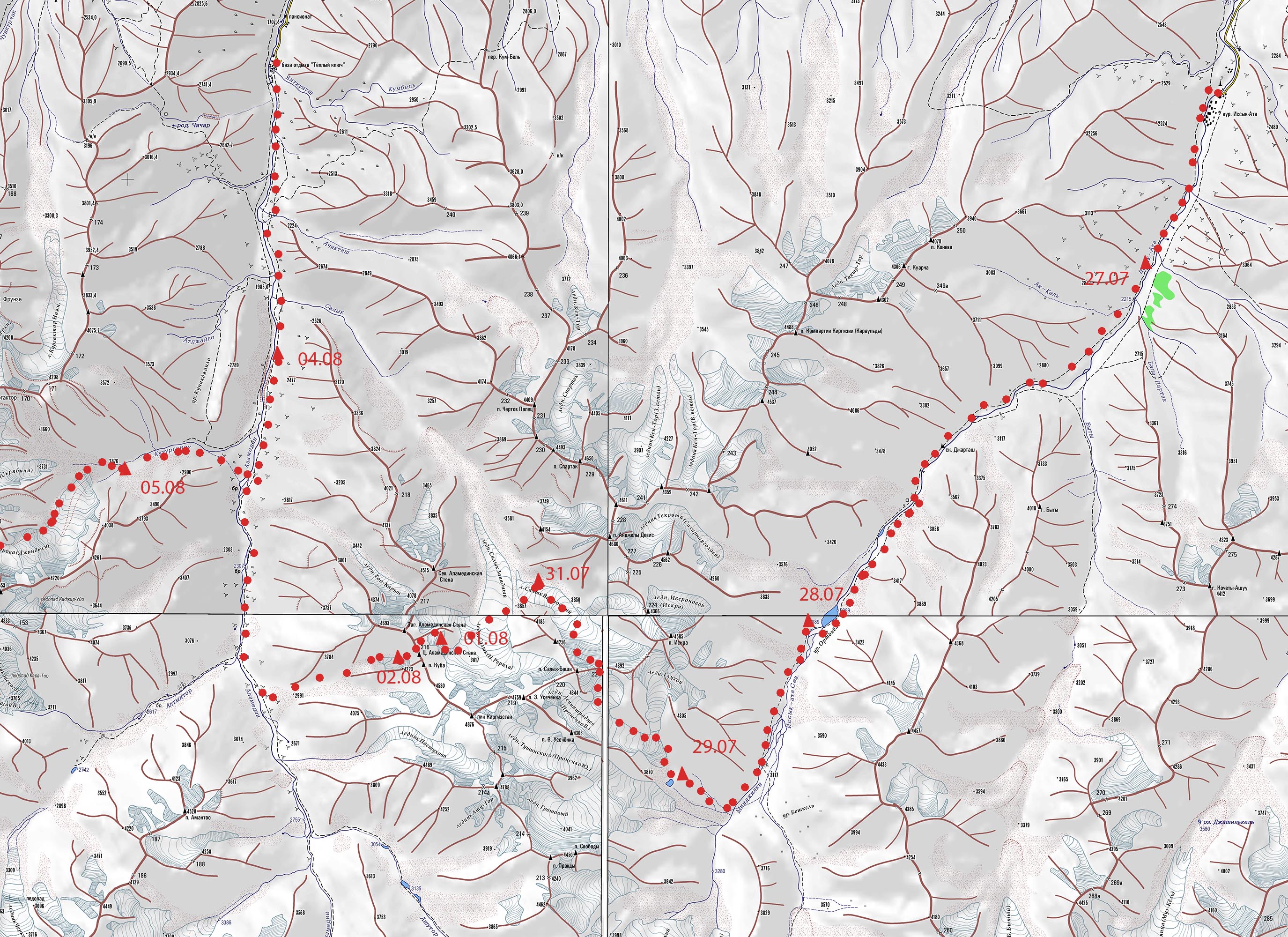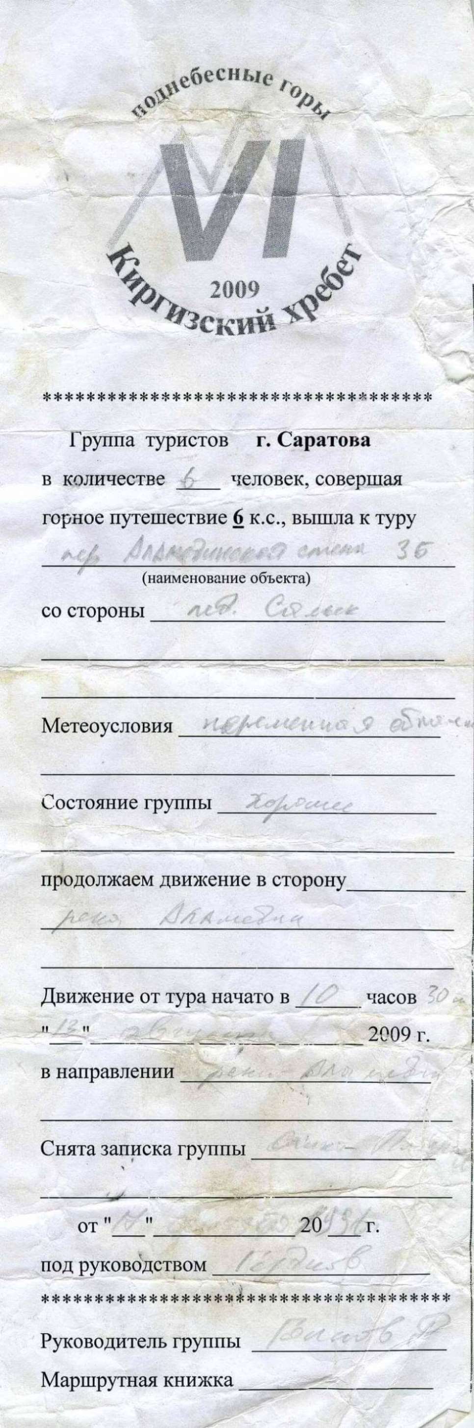 Нитка маршрута. р. Иссык-Ата - р. Минджилки - р. Минджилки - лед.Ленинградцев (Проценко В.) (р.Ыссык-Ата) - Салык-Ашу(4450, 2Б, 221) - лед.С.Рериха (Салык В.) - Л. Салык - Западный гребень - Аламединская стена(4340,3Б,216) р. Аламедин (2300) - забираем заброску в пос. Теплый Ключ. - переправа- р. Аламедин Р. Кутургансу - Р. Кутургансу - лед.Забирова(Джиндысу) - Хрустальный (4490, 3Б, 152) - Спуск на лед.Маяковского (Каратоо) -- Космонавтов(4610,3А,сн-ск-лд,150). - альпбаза Аллаарча - р.Ала-Арча - озеро (3545) - ледн. Малый Алаарчинскийи Зап. (ледн.№241). Асаналиева(3929,1Б,сн-ос,91) - ледн.Федоровича (Молодая гвардия, ледн.№209),)- р. Чонтор - р. Скокулук - пос.Белогорка Список пройденных перевалов.