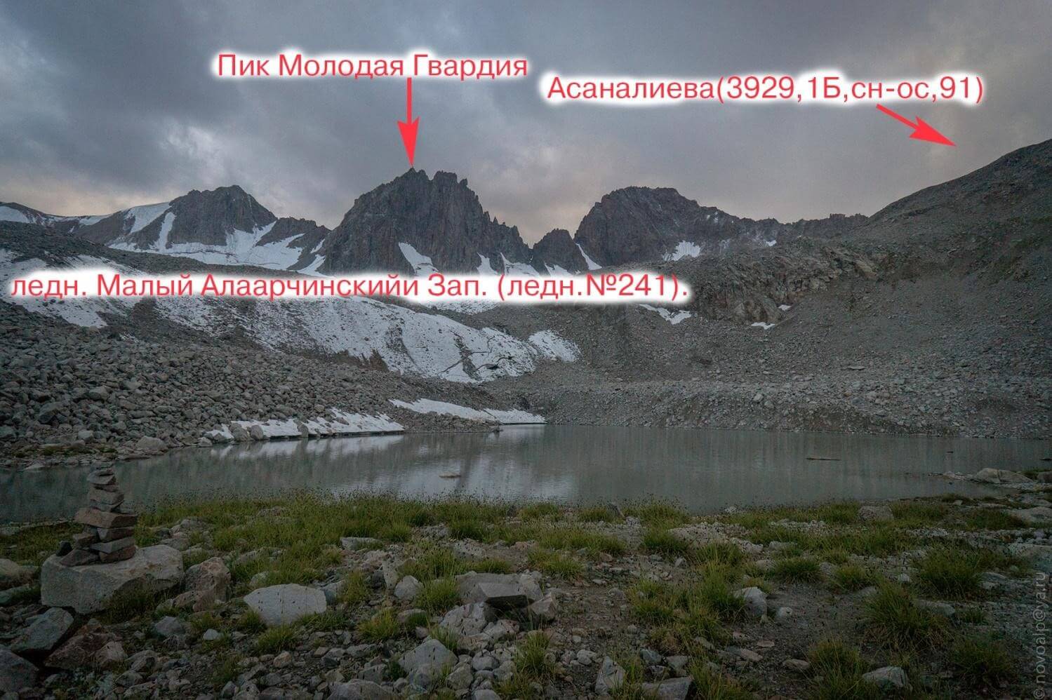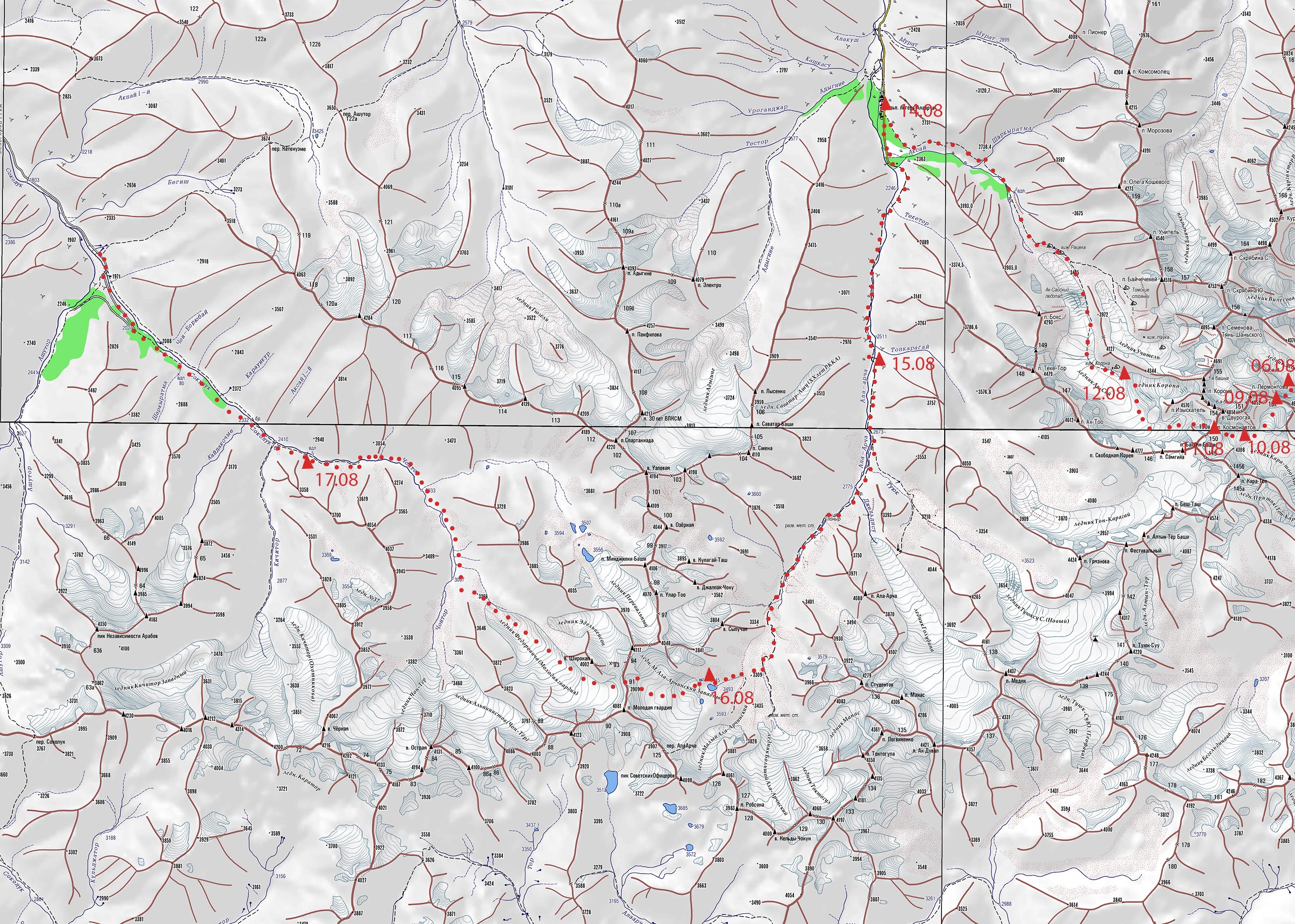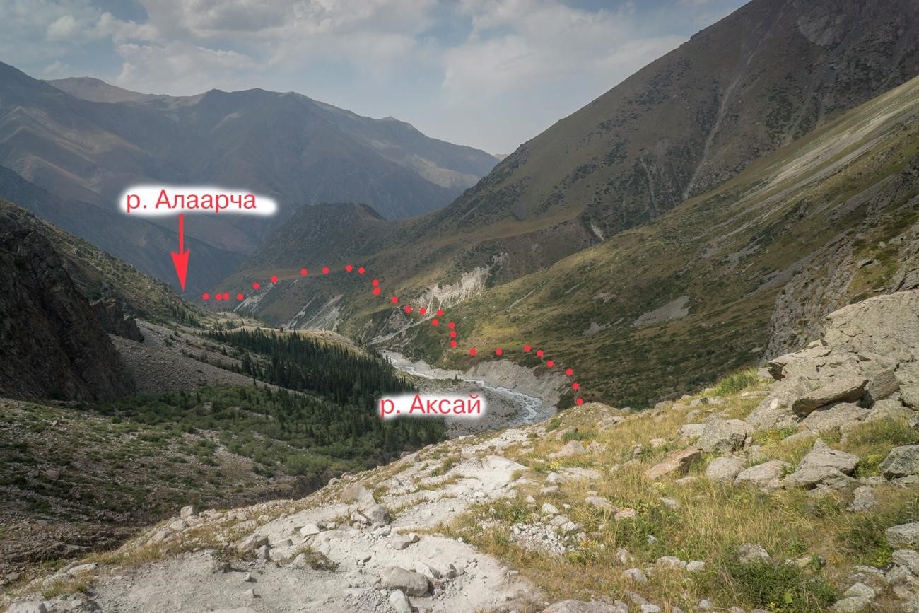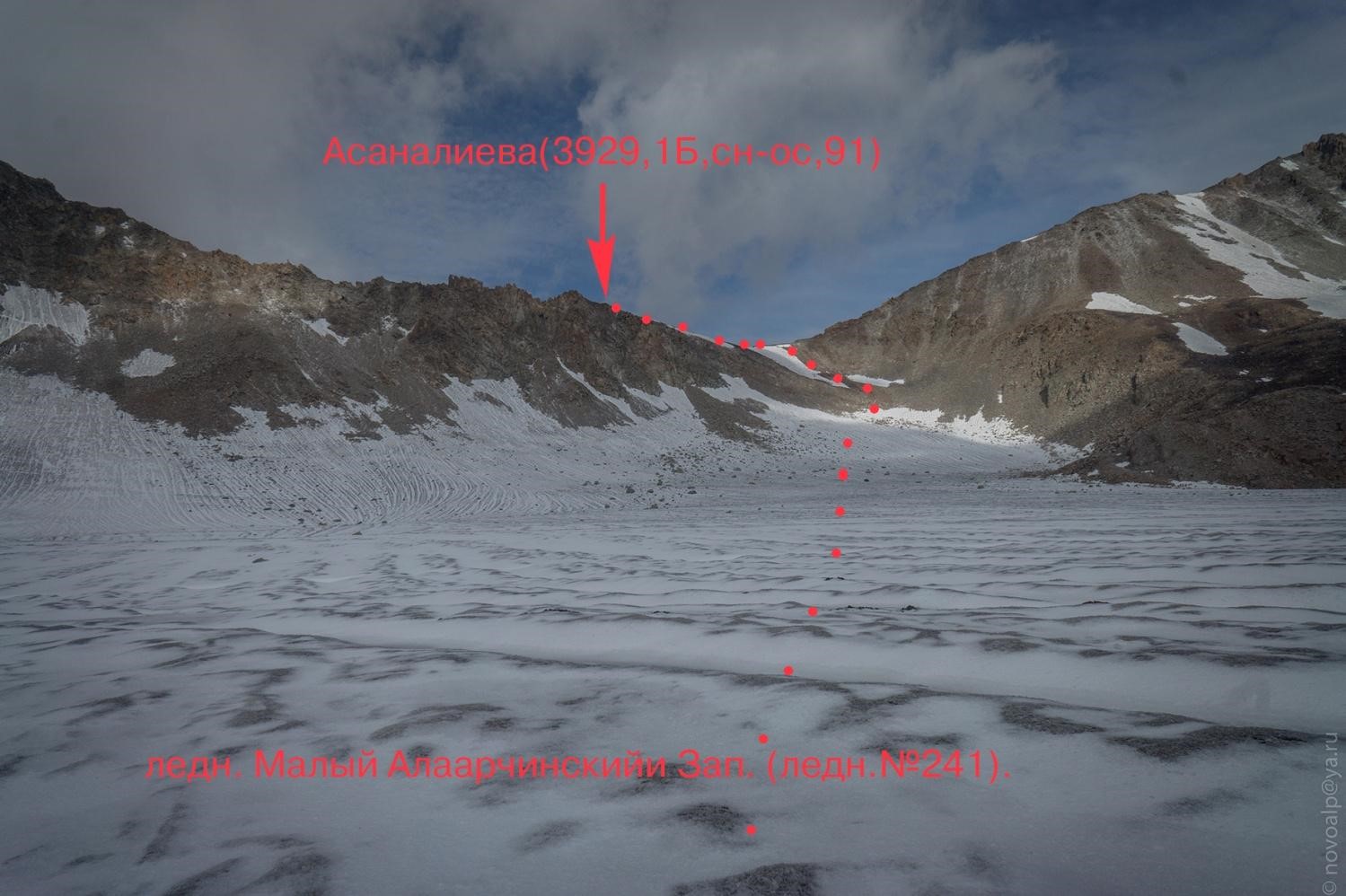 Рис 5.15. Место проведения дневки в поселке Алаарча. Перевал Асаналиева(3929,1Б,сн-ос,91). Соединяет. ледн. Малый Алаарчинскийи Зап. (ледн.№241). - ледн.Федоровича (Молодая гвардия, ледн.№209). Описание дается от поселка Алаарча до пос. Белогорка. Прохождение заняло 4 дня. 14 августа 2019г. Следует заметить, что когда-то в верховьях реки Алаарча была горнолыжная база и метеостанция. Поэтому туда вела тракторная дорога. Остатки которой можно видеть и по сей день. Итак вышли в 14:00. Путь идет по цивилизованной дороги вверх по долине. Потом асфальт кончается и дорога пересекает широкие розливы реки Аксай (см. рис. 6.01), потом через мост переходит на левый (орографически) берег (см. рис. 6.02). А потом есть нечто, напоминающее мост. И по нему можно перебраться на правый (орографически) берег. А можно и не делать. Мы так сделали и переправившись заночевали. Погода портилась, временами даже чего то начинало сверху лится. Дошли сюда мы за 4 перехода по 30 минут. 15 августа 2019г Вышли в 7:00. Тропа идет по правому (орографически) берегу. Через реку Джельдису есть симпатичное бревно(см. рис. 6.04). Встретили маньяка с велосипедом из Бельгии, готовится к какому то марафону(см. рис. 6.05). Тропа идет выше, по моренному валу переходим на другой берег (левый орографически). Справа есть развалины Метеостанции. Потом у остатков очередной оконечной морены видим трактор. Начинает идти и заканчивается снег. Вовремя поворачиваем направо (по ходу) и идем наверх. Проходим нижнее озеро(см. рис. 6.06). И на берегу верхнего останавливаемся(см. рис. 6.07). 7 переходов по 30 минут. 14 часов дня. Ставим лагерь, прячемся от непогоды. 16 августа 2019г Перевал 1Б категории проходится так. Выходим в 7:00. По осыпи выходим на лед. Одеваем кошки. Проходим открытый ледник крутизной до 30 градусов на индивидуальной технике. Траектория движения видна на рис. 6.08. В 9:30 стоим на перевале(см. рис. 6.09). Погода не очень спешим вниз. Сняли записку турклуба «Гадкий утенок» (см. рис. 6.10). Полчаса по осыпи и мы на леднике(см. рис. 6.11). Тот снова открытый, пологий. Одеваем кошки(см. рис. 6.12). Просто идем вниз. Слезаем со льда, снимаем кошки. Дальше идем левым берегом местной речки пока не упираемся в бараньи лбы. Забираем влево и слезаем в долину реки Чонтор по хитрой траектории отображенной на рис. 6.14. Дальше идем по правому берегу Чонтора пока тот не становится Сокулуком(см. рис. 6.16). Переходим в брод на левый берег и по тропе доходим до замечательных площадок(см. рис. 6.17). Там останавливаемся на ночлег. 17 августа 2019г Выходим около 8-ми утра. Сперва тропа, потом восхитительный водопад (см. рис. 6.18) на речке с нечитаемым названием, потом опять тропа, потом дорога. В поселке Белогорка нас ждала машина и дождь.