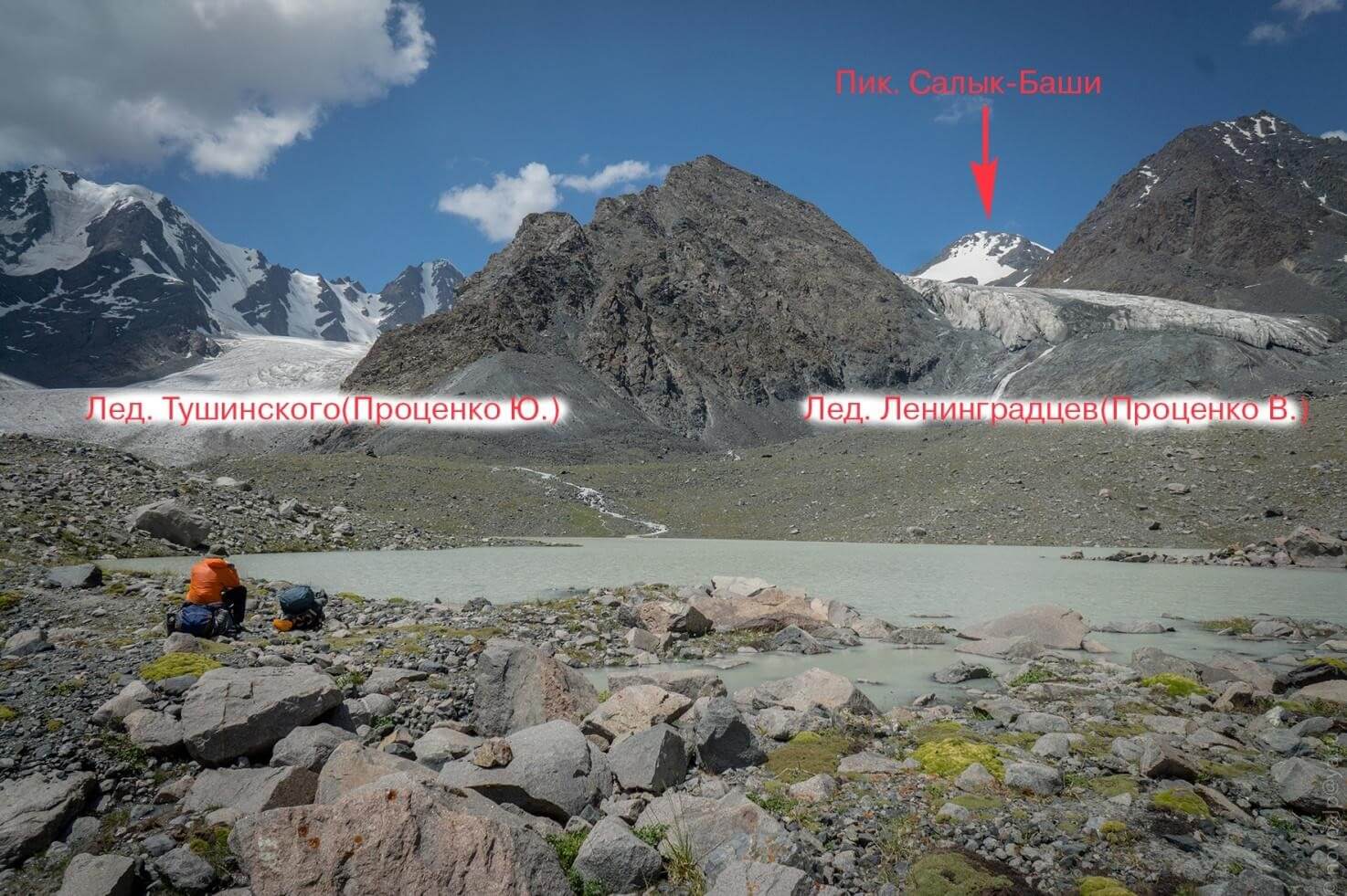 Рис 2.03. Вид на верхнее озеро и ледники Тушинского и Ленинградцев.