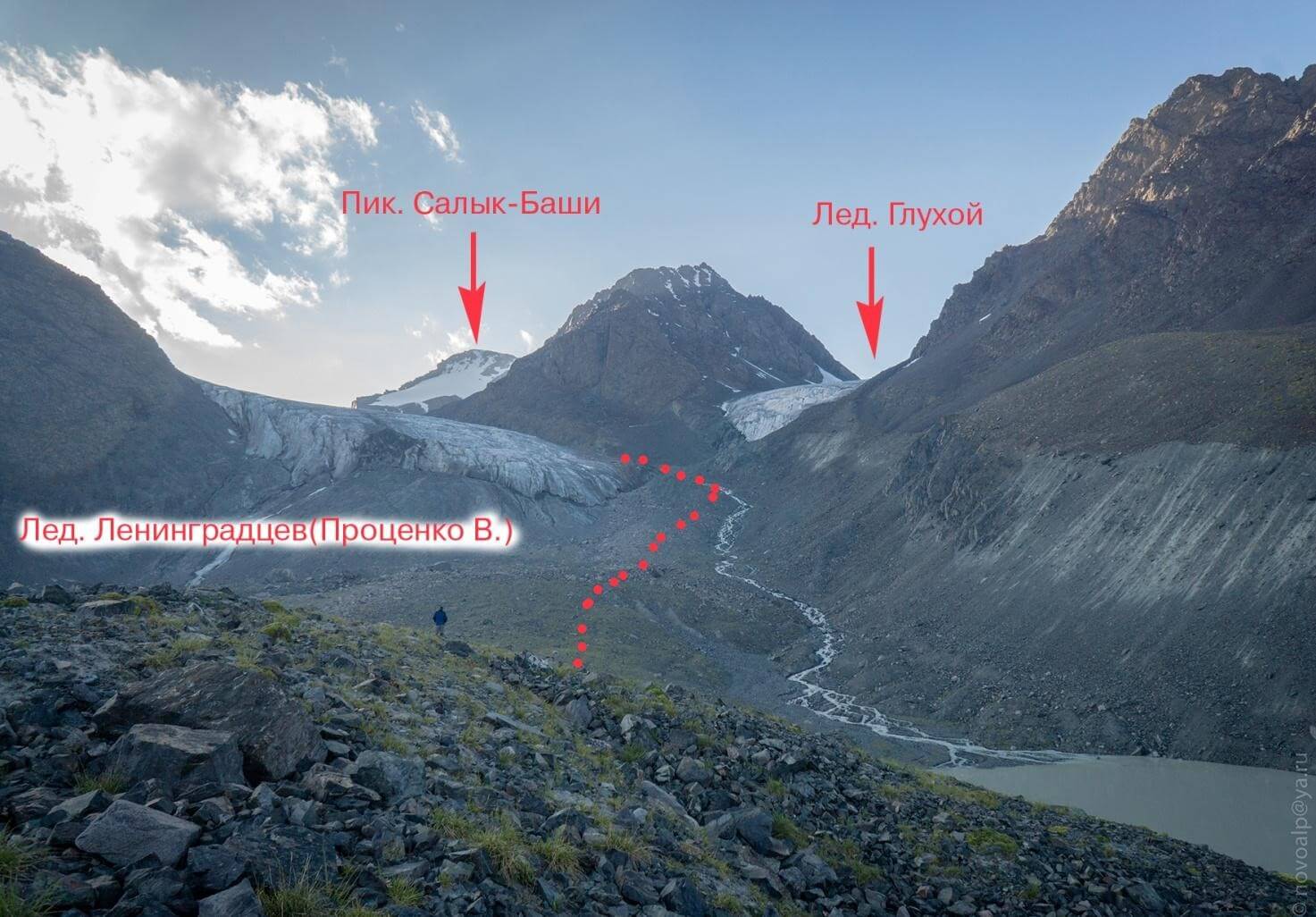 Рис 3.01. Вид на лагерь и слияние ледников Салык и путь движения в сторону пер. Аламединская стена(4340,3Б,216).