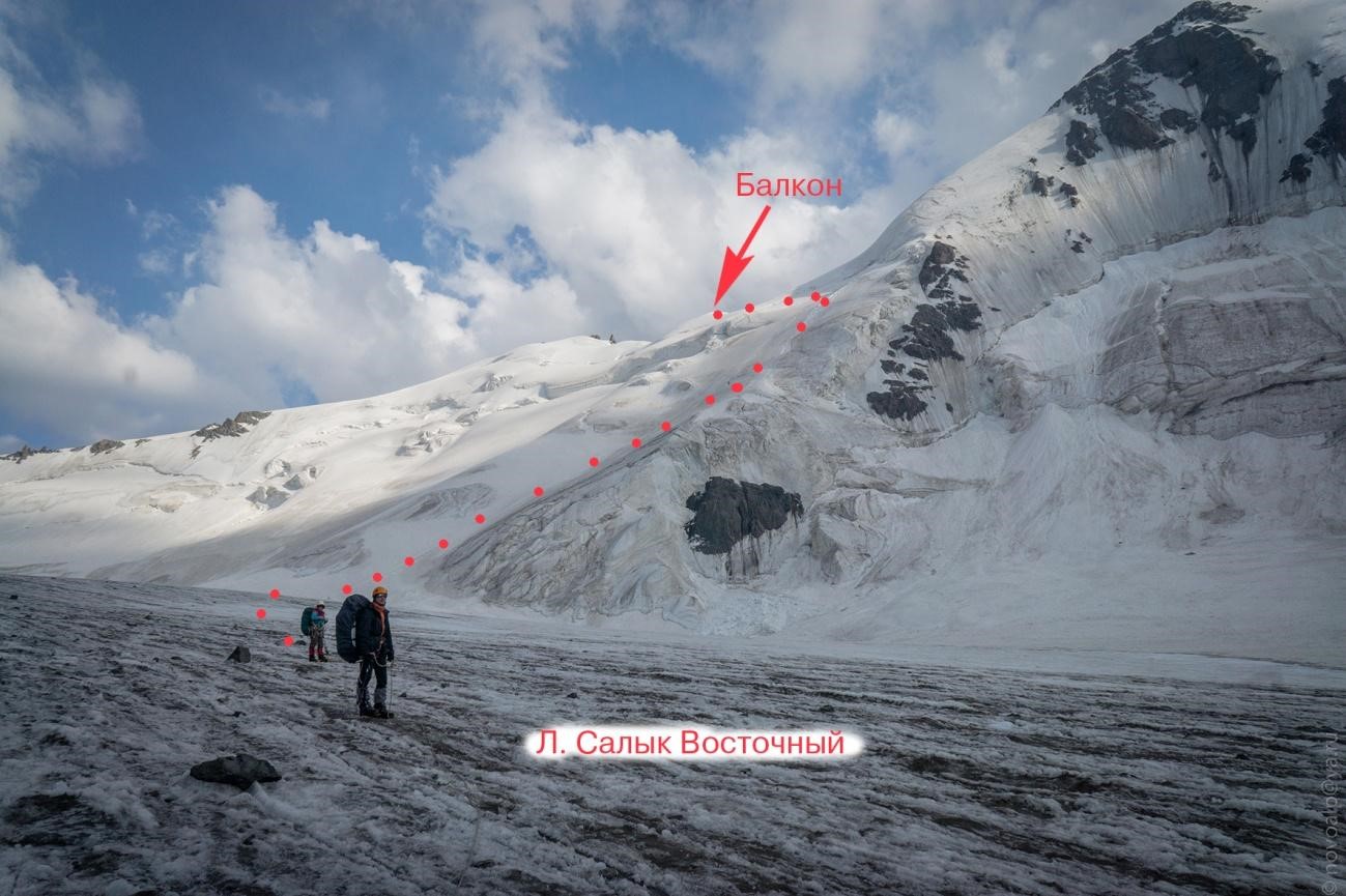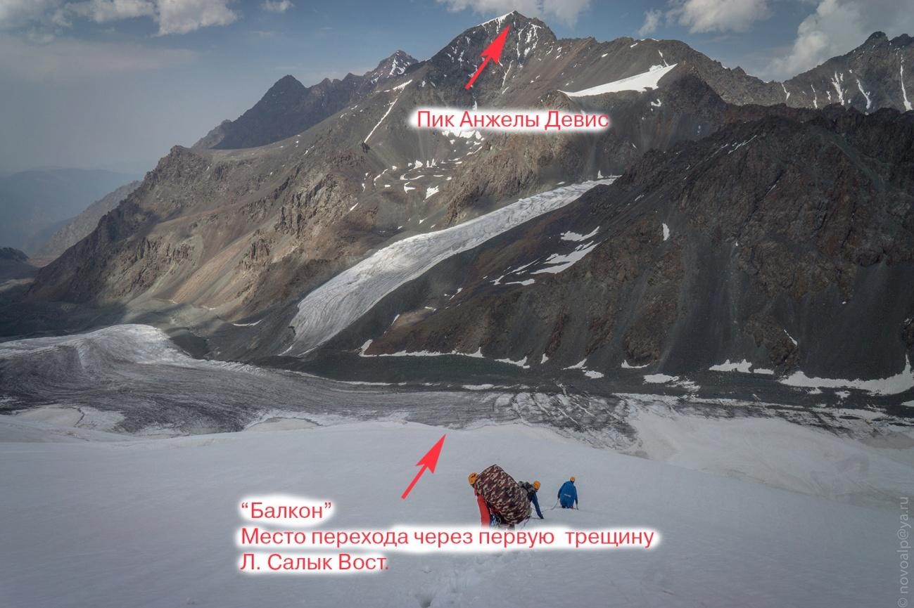 Рис 2.19. Нижняя часть спуска с пер. Салык-Ашу(4450, 2Б, 221) на лед.С.Рериха (Салык В.). Седловина перевала находится за «балконом»