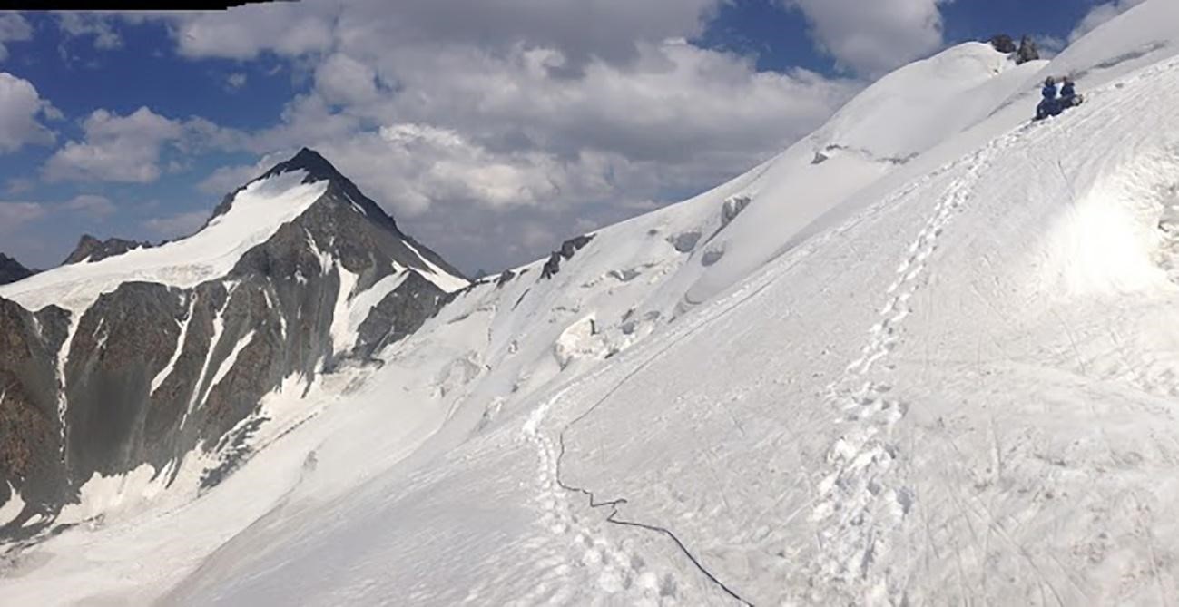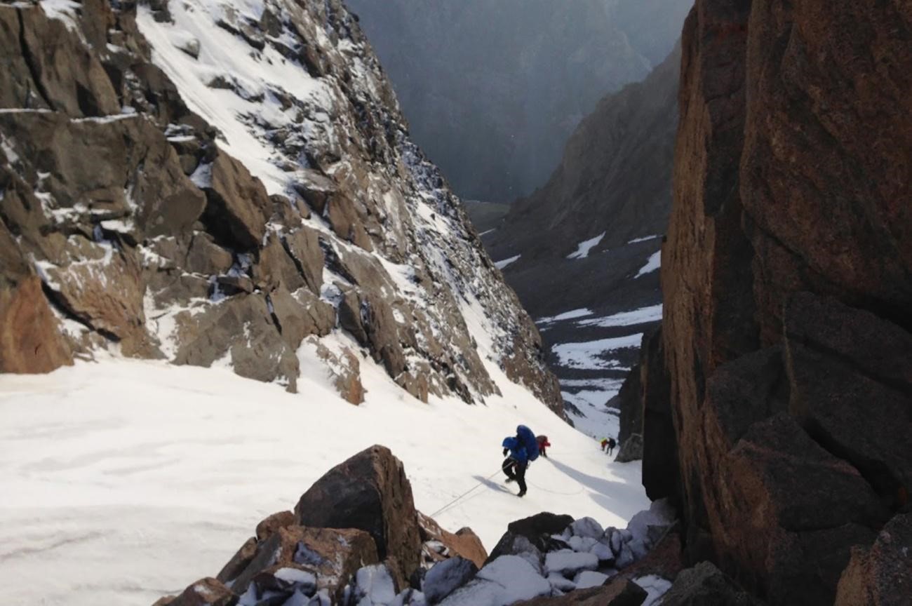Рис 2.13. Первая связка начинает движение с пер. Салык-Ашу(4450, 2Б, 221) в сторону «балкона». Внизу лед.С.Рериха (Салык В.).