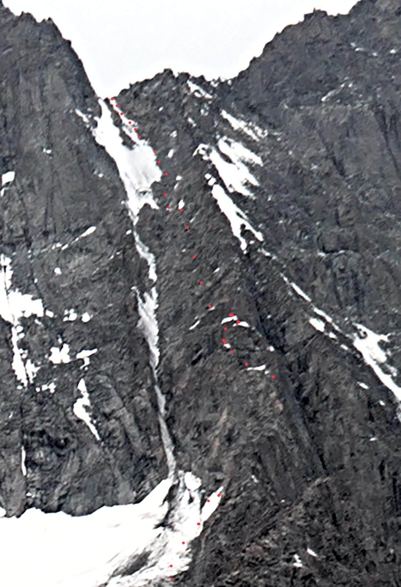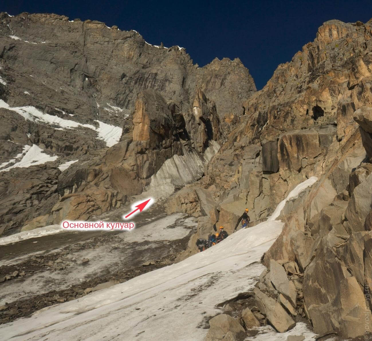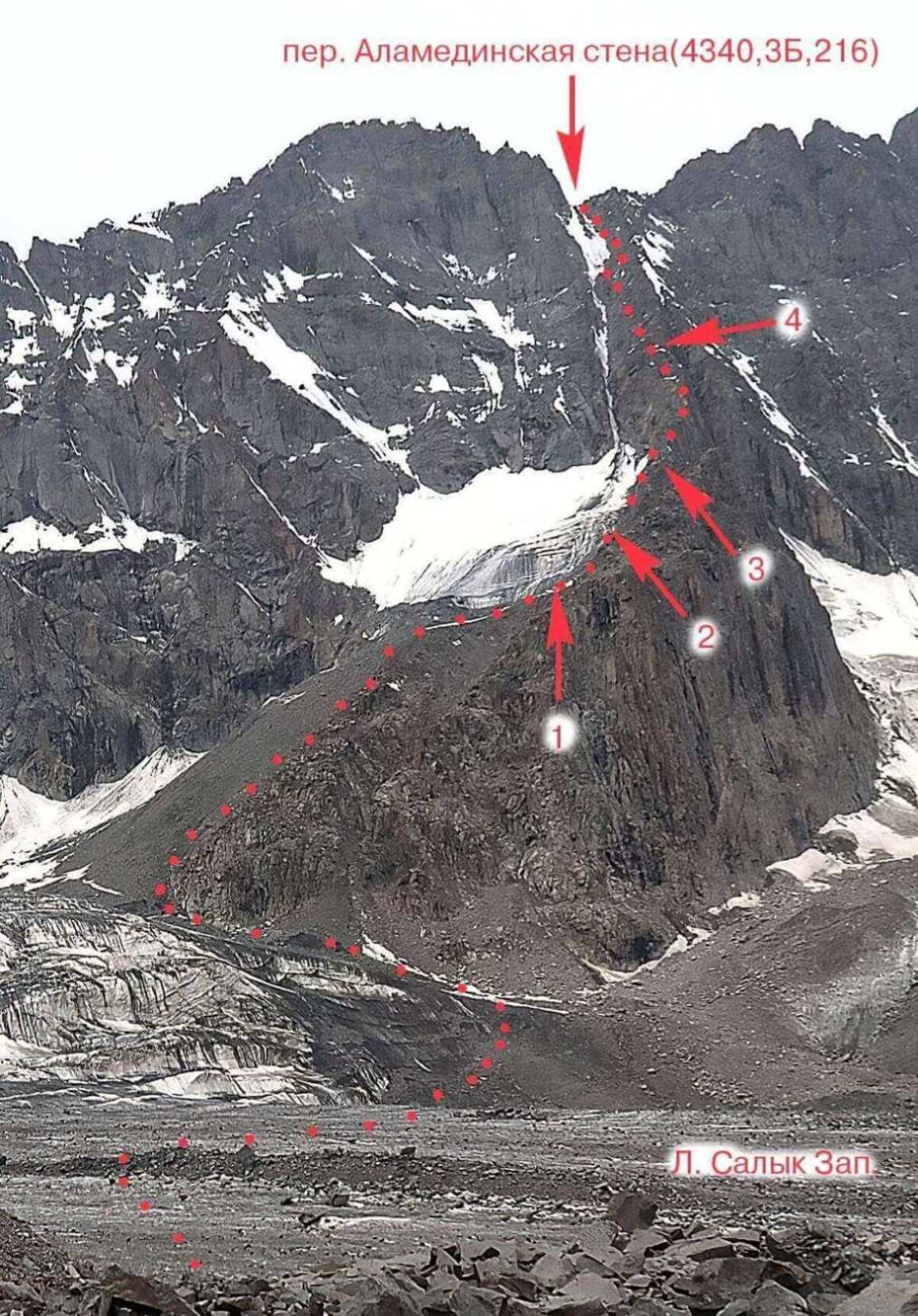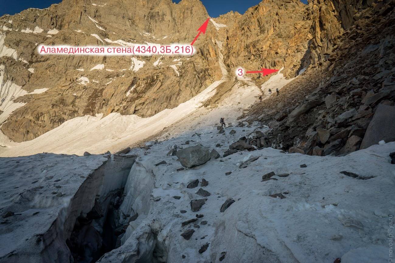 Рис 3.03. Вид на пер. Аламединская стена(4340,3Б,216) с востока. Показан путь подъема.