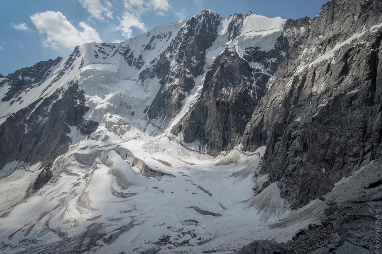 Рис 3.08. Вид на пер. Аламединская стена(4340,3Б,216) с востока. Верхний ледник.