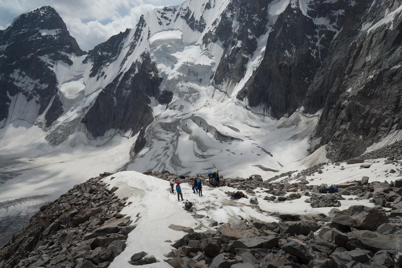 Рис 2.20. Группа на лед.С.Рериха (Салык В.). Перевал Аламединская стена(4340,3Б,216). Находится в северной оконечности Аламединской стены. Соединяет лед.С.Рериха (Салык В.)и бассейн реки Аламедин. Описание дается от слияния ледников Салык Западный и Салык Восточный до тропы в долине реки Аламедин. Прохождение заняло три дня. 31 июля 2019г. С ночевок в правом моренном кармане ледника Салык Восточный вышли в 10:00 утра. Смотри рис. 3.01. Поскольку во время дневки просмотрели слияние ледников, которое сильно порвано, было принято решение сперва подняться несколько назад, чтобы пересечь тело ледника Салык Восточный по ровному льду. И на ледник Салык Западный переходить ближе к бастиону на слиянии ледников. Ледник открытый, однако подъем на лед довольно крутой. 30 метров набора. В нижней части 3 метра до 35 град. Проходим в кошках на индивидуальной технике. Далее шли по ровному леднику. За один переход (30 минут) дошли до моренного чехла. При выходе на камни сняли кошки. Само место слияния представляет несколько моренных чехлов с разломами льда. Никаких особых трудностей нет. Еще за один переход (30 минут) вышли на ленник Салык Западный. Ледник до момента выхода на камни на левом борту пересекали в кошках. Смотри рис.3.02. Голый, ровный лед, немного трещин идти легко. Затратили еще 25 минут. Дальше поднялись по ледовому склону покрытому средней осыпью. Погода начинает потихонечку портиться временами набегают тучи, зато не жарко . Дальше поднимались в кармане ледника, обходя скальный массив (налево по фотографии). Там не крупная осыпь. Отдыхали на осыпном склоне, повернув, по ходу, направо. Еще переход 30 минут. Дальше крутизна осыпи выросла до 30 градусов. Поделились пополам. Шли двумя плотными группами с достаточным интервалом, дабы не спускать друг на друга камни. Потом стало выполаживаться. Смотри рис. 3.04. За 40 минут дошли до остатков ледничка. Помечен цифрой один на рис. 3.02. Он находится на самом краю «подушки». Снег, который лежал поверх льда, позволил выровнить места под палатки. Место безопасное. Камни из основного кулуара сюда не долетают. Но других безопасных мест под стоянки здесь нет. Лагерь начали ставить около двух часов дня. Когда поставили, состоялся небольшой снегопад, который, впрочем, носил достаточно декоративный характер. В это время группа обедала и отдыхала. Было не очень понятно, как выходить на верхний ледник «подушки». Ледовый склон, который смотрел на юго-восток, был крутой (более 30 градусов), и по нему временами летели камни, причем, некоторые явно выкатывались из основного кулуара. Около пяти часов вечера была произведена разведка кулуара, который находится справа походу и проходит по примыканию скал ко льду. Помечен цифрой один на рис. 3.02. Камни с основного кулуара сюда не долетают. Да есть местные, которые лежат на льду и их по неаккуратности можно спихнуть, но этого можно свершено спокойно не делать. В верхней части довольно круто, до 35-ти градусов и было решено провесить здесь веревку перил. 1 августа 2019г. Проснулись, позавтракали затемно. По первому свету в 5:30 участники стали выходить. Эта сторона имеет восточную экспозицию и солнце сразу начинает освещать путь подъема. Двигались группами по 3-4 человека. Спустя час первые участники прошли веревку 1 в кулуаре и подошли к основному участку подъема. Рис. 3.08 и 3.02 точка 3. Веревка 2. Скалы средней слож