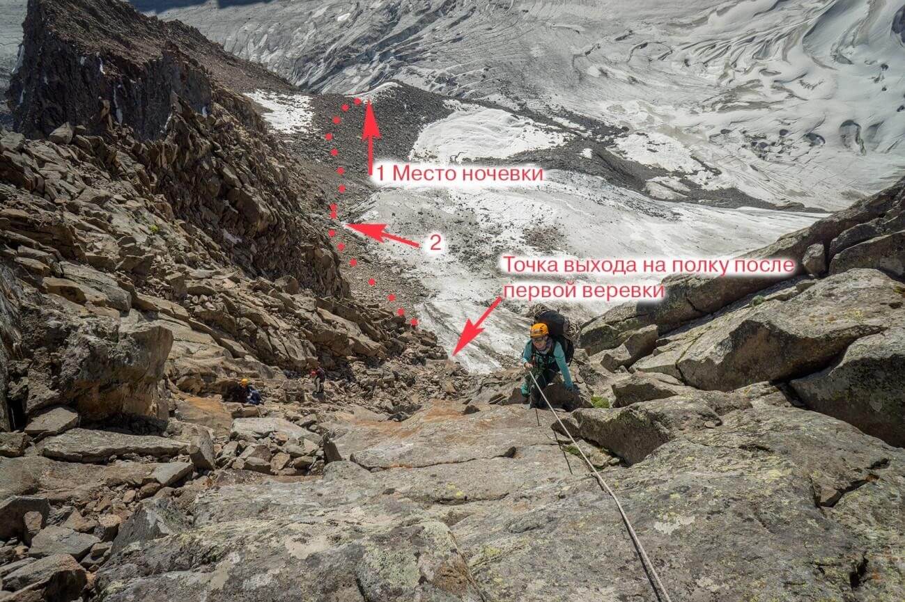 Рис 4.10.Скальная площадка где была организована ночевка при подъеме на пер.Хрустальный (4490, 3Б, 152).