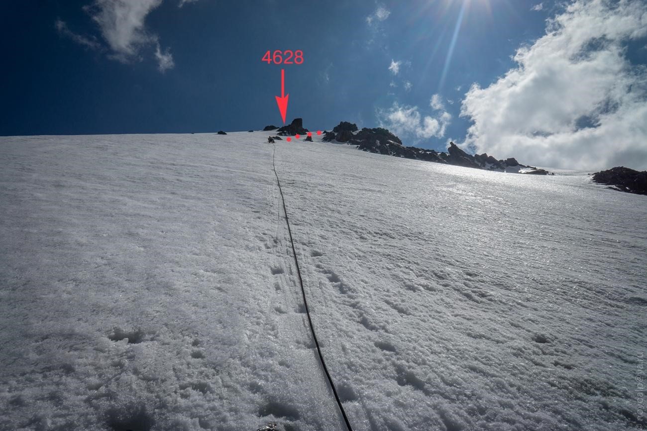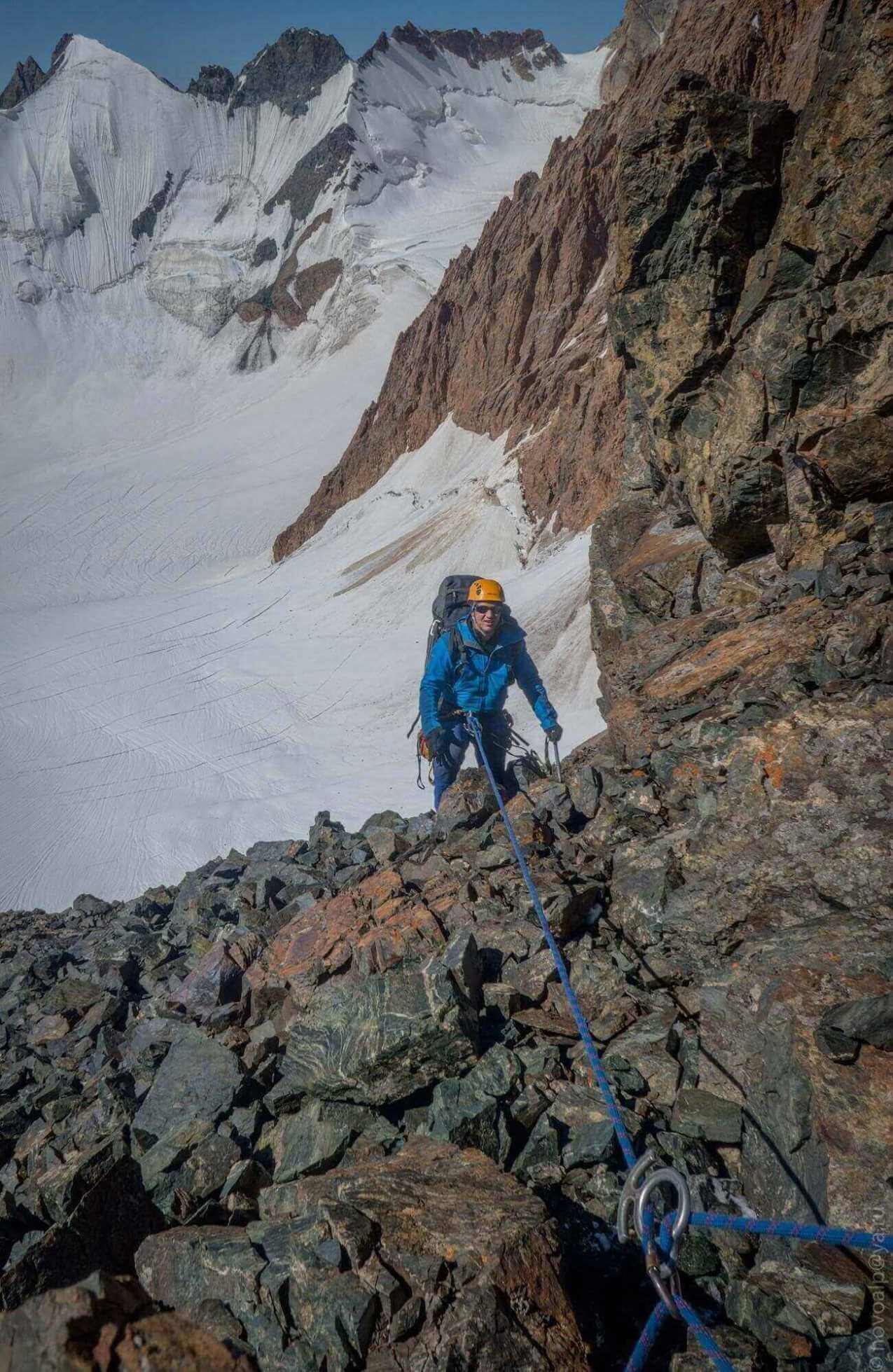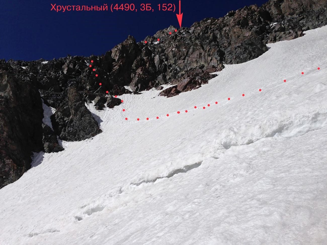 Рис 4.13. Траверсный участок под вершиной 4628 и полверевки спусковых перил при подъеме на пер. Хрустальный (4490, 3Б, 152).
