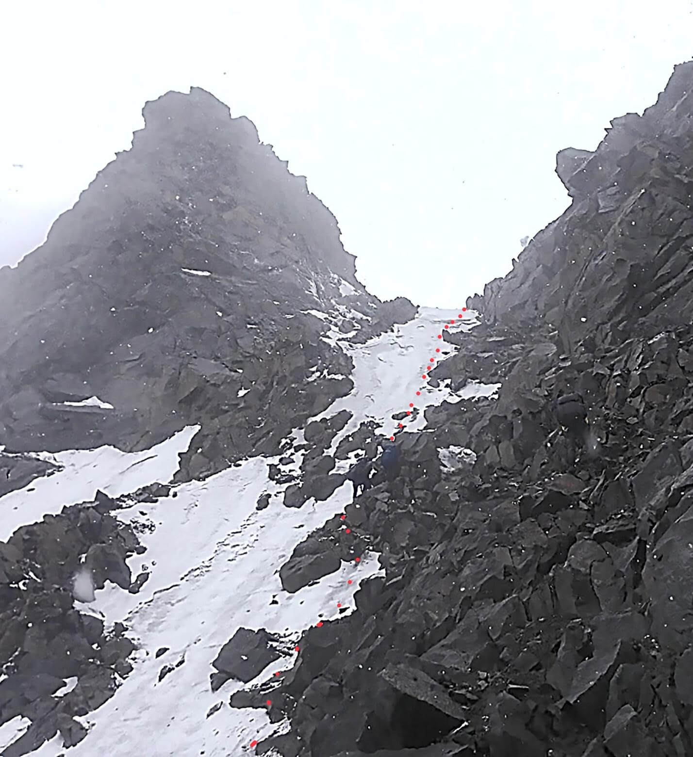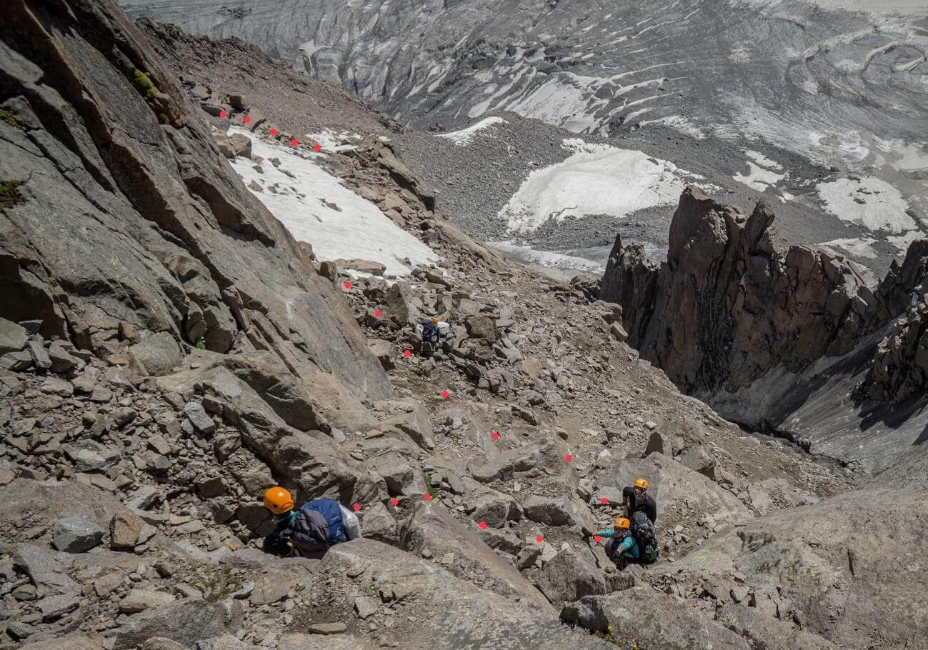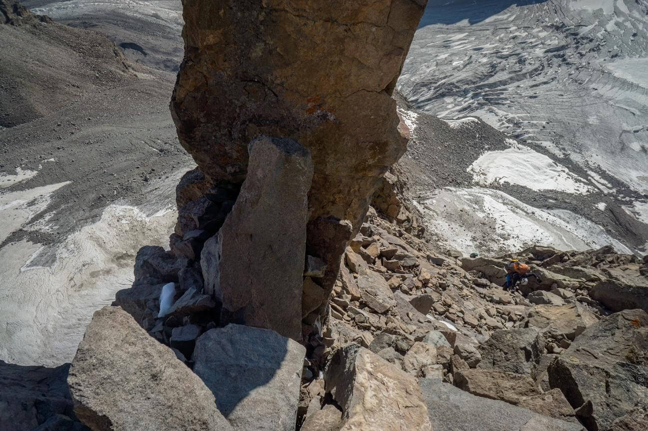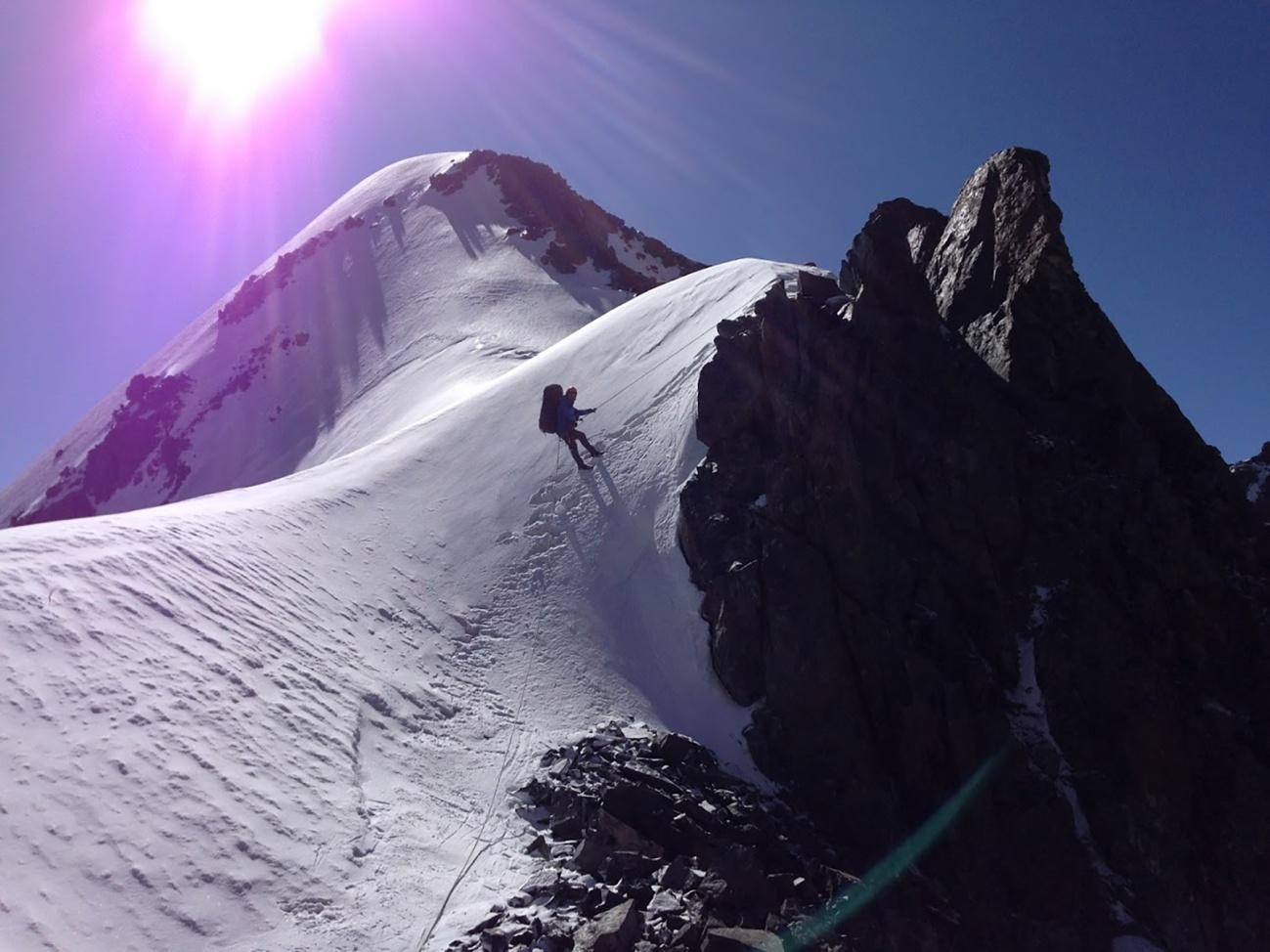 Рис 4.13. Траверсный участок под вершиной 4628 и полверевки спусковых перил при подъеме на пер. Хрустальный (4490, 3Б, 152).