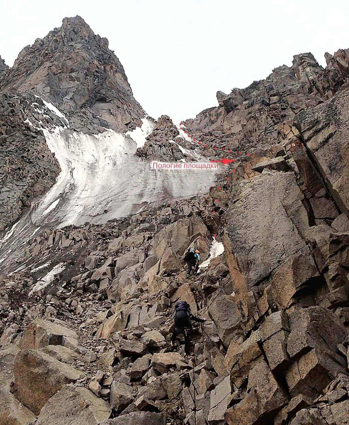 Рис 5.03 Первая большая полка после второй веревки. Подъема на пер. Космонавтов(4610,3А,сн-ск-лд,150) со стороны лед. Маяковского (Каратоо).