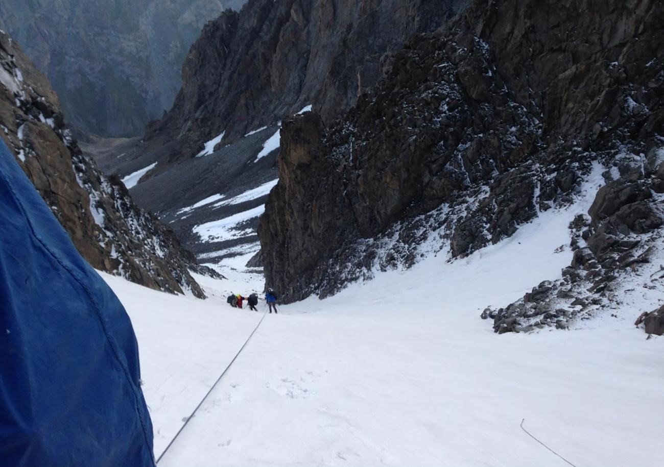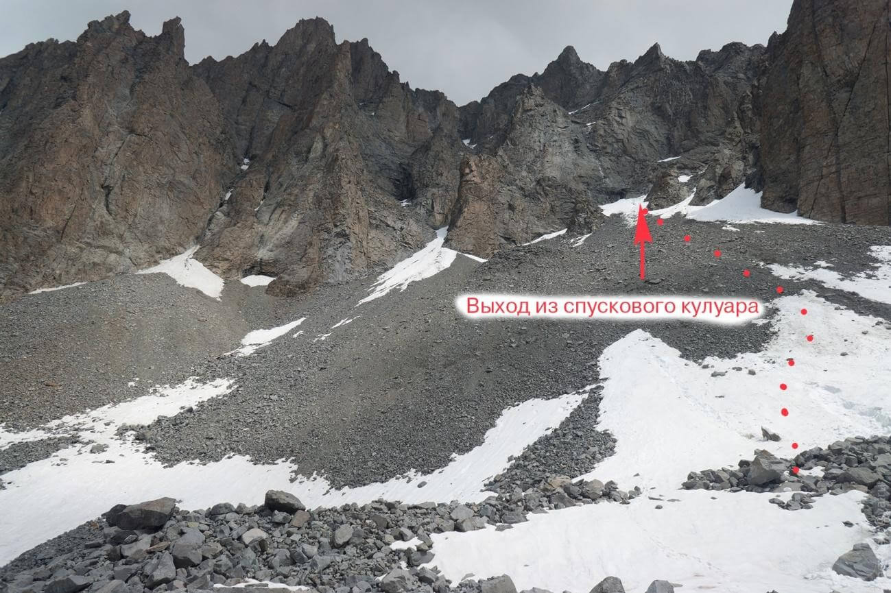 Рис 4.22. Путь спуска с пер. Хрустальный (4490, 3Б, 152) на ледник Маяковского (Каратоо). Перевал Космонавтов(4610,3А,сн-ск-лд,150). Соединяет лед. Маяковского (Кара-тоо) и лед. Аксай. Описание дается от ночевки на лед.Маяковского (Кара-тоо) до поселка Алаарча. Прохождение заняло 3 дня. 10 августа 2019г. Выходим в 7:00. За 30 минут в связках проходим под бергшрунд. См. рис. 5.01. Верхний край из мягкого снега, крутой и держит очень плохо. Приходится помогать вылезать. См. рис. 5.01. До скал поднимаемся в связках. Дальше начинаем вешать перила придерживаясь левого по ходу борта. Вниз в кулуар не хочется, там постоянно летят камни. Ситуация сильно напоминает перевал Аламединская стена. После второй веревки вылезаем в право на скальную полку. Рис 5.01 По дороге везде разложены свежие камни, и нужно быть крайне осторожным. Становится понятным, что обещанного льда до перевала теперь нет вообще. Принимаем решение двигаться дальше. По полке можно пройти 20 метров пешком, но потом необходимо снова вешать перила. Дальше две веревки потенциально опасны. Дело в том, что в верху слева по ходу есть боковой кулуар и оттуда иногда летят камни. Не часто, мы когда шли видели это дважды. Они могут рикошетировать от нашего борта и представляют собой значительную опасность. Однако когда они летят слышно заранее, на пути есть места, где можно спрятаться. Были выставлены наблюдатели. И эти две веревки проходились по одному. Следует заметить, что скалы на всем подъеме не сложные, крутизна 35-50 градусов, есть полки, лазание не сложное. После четвертой веревки основной кулуар перевала расширяется, и можно уйти правее по ходу, а камни из бокового кулуара сюда уже не долетают. Однако при движении нужно быть предельно осторожным, чтобы веревкой не сдернуть на себя камни. См. рис. 5.04. После шестой веревки есть шикарная полка где может посидеть вся группа. Есть вода. После этой полки кулуар начинает забирать в право по ходу и становится наконец ледовым. Одеваем кошки. Сначала лед 40 градусов потом поположе. Две веревки перил (7и8) и перевал достигнут. См. рис. 5.05. Группа собралась на перевале в 18:00. Сперва, сгоряча решили спускаться, но разум возобладал. Остались ночевать на перевале. Построили площадку на которой разместились лежа. См. рис. 5.06. Нашли записку (рис. 5.07) была без банки в мокром пакете, почти не читается. 11 августа 2019г. Спуск начали в 8:00. Прямо вниз идут два скально-осыпных кулуара. Камни нам начинают двигаться от малейшего чиха. Поэтому Спускаются по правому кулуару, а потом по скальной полке уходят в лево, дабы укрыться от камней. Первый участник когда спускался как мог прочистил и поспихивал, но все равно этого было мало. Но поскольку точки ниже по склону были расположены грамотно, достаточно далеко влево все летело мимо. По рис 5.08 понятно, где были расположены точки крепления перил. Первая веревка крепилась на спусковую петлю все остальные на ледобуры. Последний для спуска использовал вывинчивающийся ледобур. На склоне был ровный голый лед до 45 град. Всего с седловины через бергшрунд было повешено 7 веревок по 30 метров. См. рис. 5.09. Помере спуска людей формировались связки и спускались до выполаживания. Вся груаа собралась здесь в 14:00. См. рис. 5.10. По факту после этого перевала у нас из четырех веревок осталось три и они были длиной не более 30 метров, в следствие побития камнями . Поэтому на Двурогую р