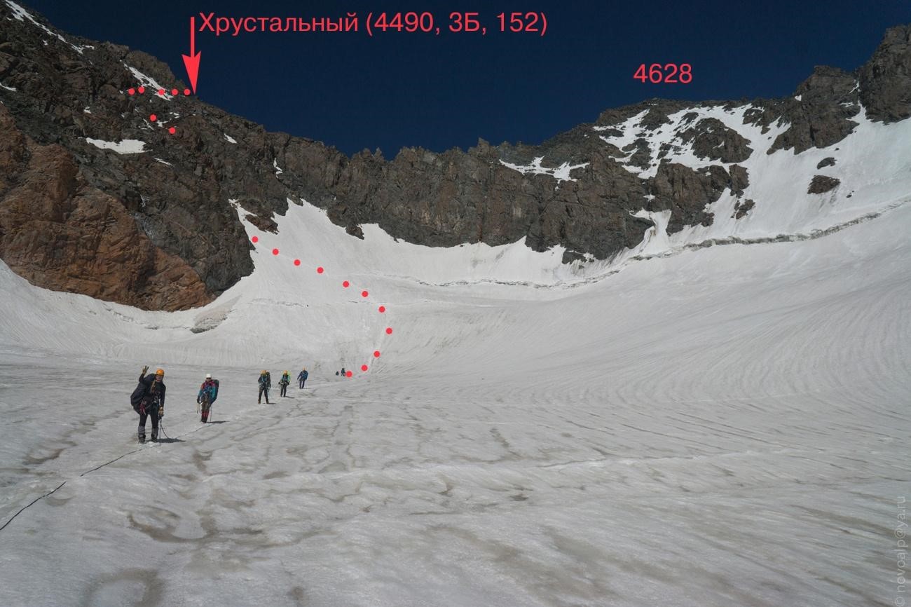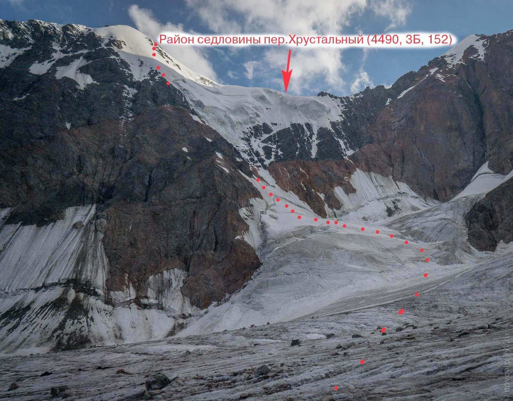 Рис 4.21. Путь спуска с пер. Хрустальный (4490, 3Б, 152) на ледник Маяковского (Каратоо).
