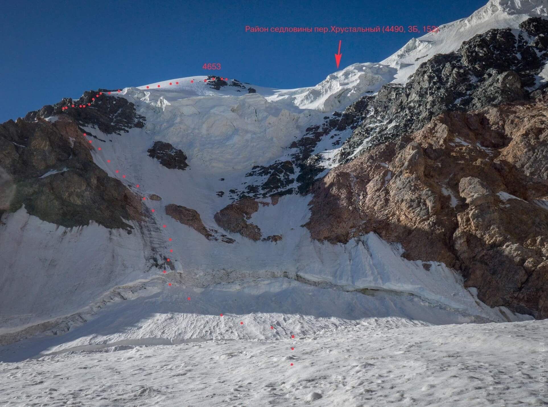 Рис 4.05. Общий вид на перевал Хрустальный (4490, 3Б, 152) с ледника Забирова.