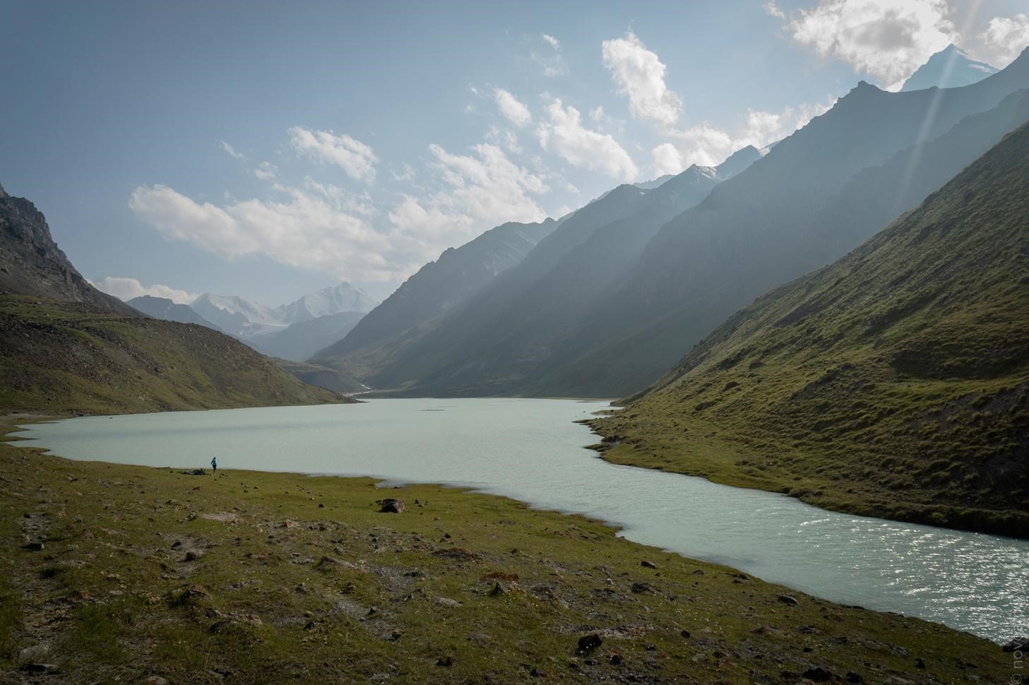 Рис 1.08. Второе озеро. р. Миджилки. Верховья р. Миджилки (р. Иссык-Ата). Перевал Салык-Ашу(4450, 2Б, 221) Соединяет лед. Ленинградцев (Проценко В.) (р. Ыссык-Ата и лед. С.Рериха (Салык В.). Описание дается от ночевок в долине р. Минжилки около озера Ортокель до ночевок в моренном кармане на слияния ледников Салык Западный и Салык Восточный. Прохождение заняло три дня. 28июля 2019г. В 7:00 вышли с ночевок. Нашли еще одно неучтенное озеро выше Ортокель. См. рис. 1.08. За два перехода по 30 минут по тропе по правому берегу (по ходу) реки Минжилки дошли до речушки которая стекает с ледника Ленинградцев (Проценко В.). Дальше поднимались вдоль реки, сперва по правому берегу, а потом по левому (все по ходу). Реку перепрыгали по камням. Внизу был травянистый склон, потом началась слежавшаяся морена. См. рис. 2.01. и рис. 2.02. За четыре перехода по 30 минут дошли до озера. Заночевали справа (по ходу) на ровных площадках. См. рис. 2.03. 29июля 2019г. В 6:30 вышли с ночевок. За 2 перехода в 30 минут подошли к началу ледника. См. рис. 2.04. Одели кошки. См. рис. 2.06. Первый переход 30 минут шли на индивидуальной технике. Максимальная крутизна при выходе на лед на коротком участке не превышала 30 градусов. См. рис. 2.07. Дальше связались. Ледник закрытый, трещины есть но их плохо видно. Один переход 30 минут до поворота по закрытому леднику. См. рис. 2.08. Еще переход 30 минут для того, чтобы набрать высоту при входе в верхний цирк перед перевалом. См. рис. 2.09. И через два перехода по 30 минут были на перевальной седловине. Снег некрутой 30-35 градусов, хорошо держит не проваливается. См. рис. 2.10. Мульда характерной формы. На перевале сняли записку СТГ НГУ (См. рис. 2.12.). Около половины второго дня начали спускаться. Выйдя на седловину, обещанного льда на спуск не обнаружили. Был слегка подкисший снег на всем пути спуска. Движение проходило следующим порядком. В сторону лед. Салык Восточный отходит «балкон». См. рис. 2.13. Крутизна снега на нем не превышает 15 градусов. В связках выдвинулись по центру на самый дальний край и обнаружили там трещину. См. рис. 2.15.,2.16. Была идея уйти вправо, но по общей форме рельефа можно было предположить, что там будут сбросы. Перелезли со страховкой по снежному мосту и по ледовому ребру двинулись влево. На перегибе и в разломе был лед и в него удалось закрутить несколько ледобуров и организовать хорошую страховку. Само ребро пологое, однако около него на локальных участках может быть больше сорока градусов уклона. Аккуратно слезли дальше влево в мульду, где было не очень круто и над второй трещиной организовали страховочную точку на ледорубах. Что позволило безопасно перелезть вторую трещину. См. рис. 2.17. На этом участке использовали тактическую схему «связка по связке». Дальше крутизна снега была около 30-35 градусов местами до сорока. Трещин не было до самого выполаживания. Двигались в связках с одновременной страховкой, сперва на три такта, а когда стало положе, лицом вниз. См. рис. 2.18. В 17:00 вышли на выполаживание Сначала, пока ледник был закрыт, шли в связках, потом развязались. . Еще через два перехода по 30 минут дошли до кармана морены. См. рис. 2.19.,рис. 2.20., 3.01. 30июля 2019г. Дневка.