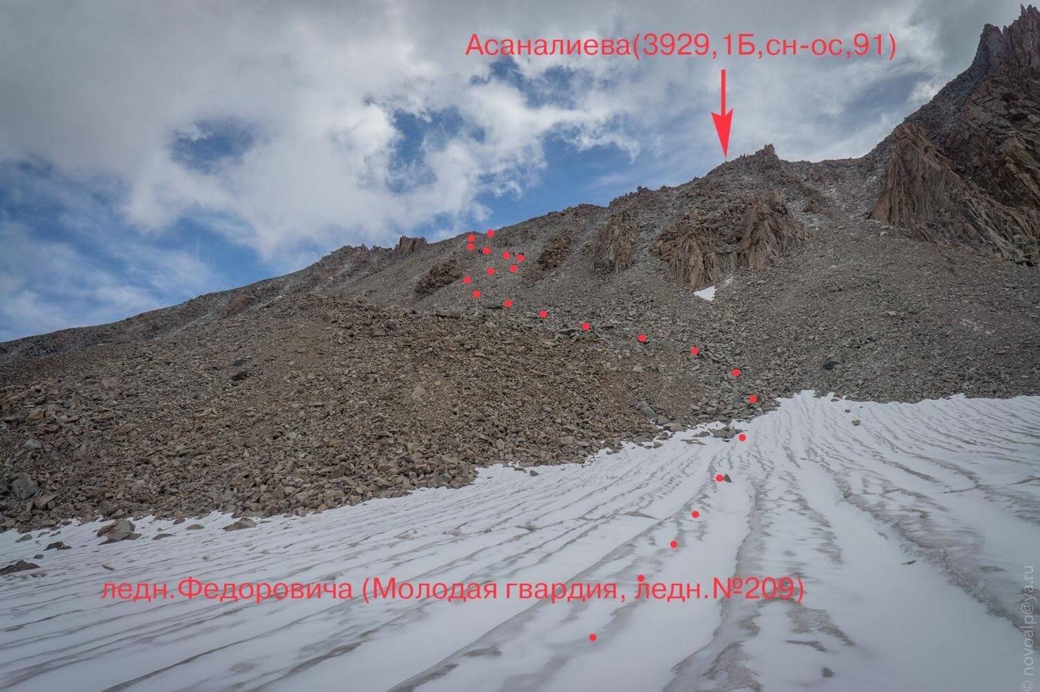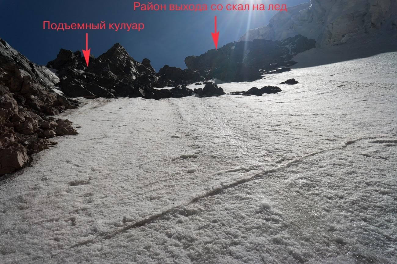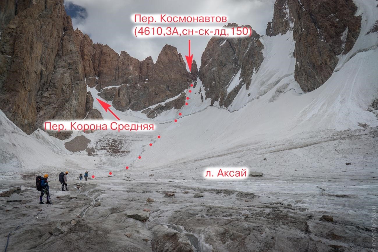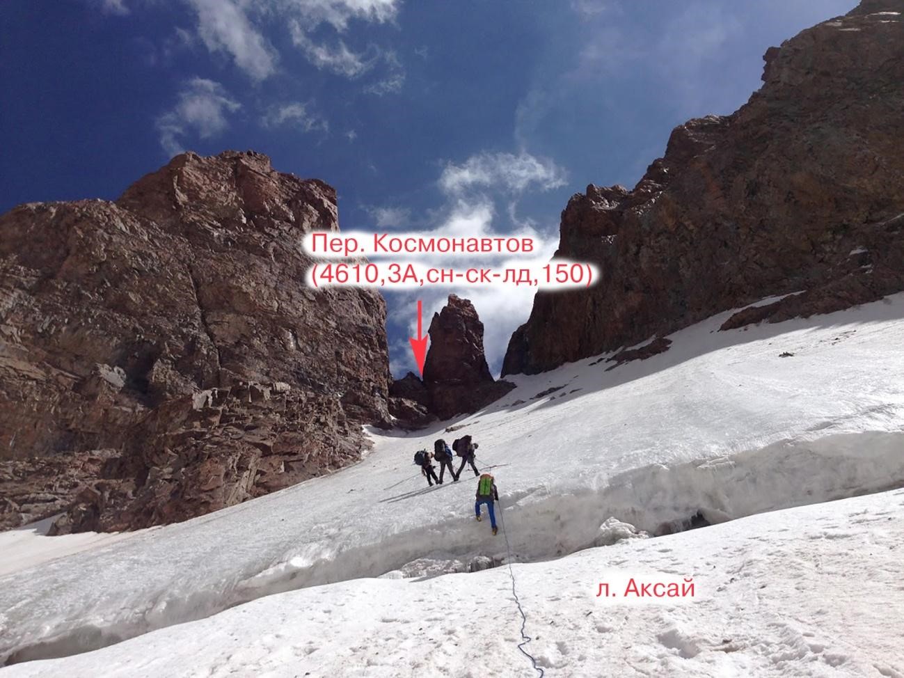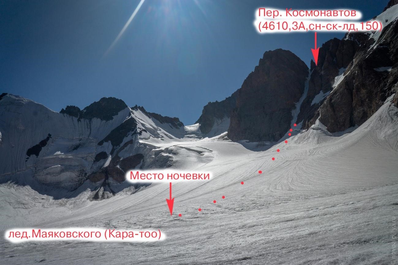 Рис 5.01 Путь подъема на пер. Космонавтов(4610,3А,сн-ск-лд,150) с ледника Маяковского (Каратоо).