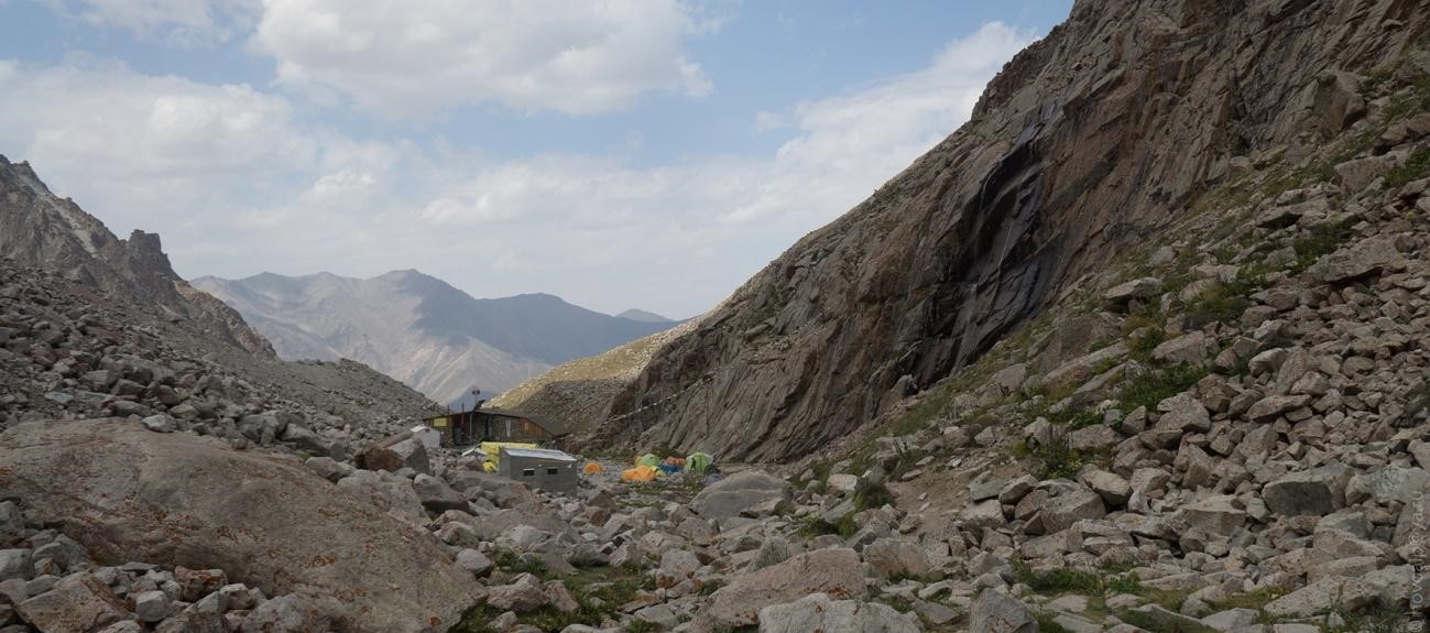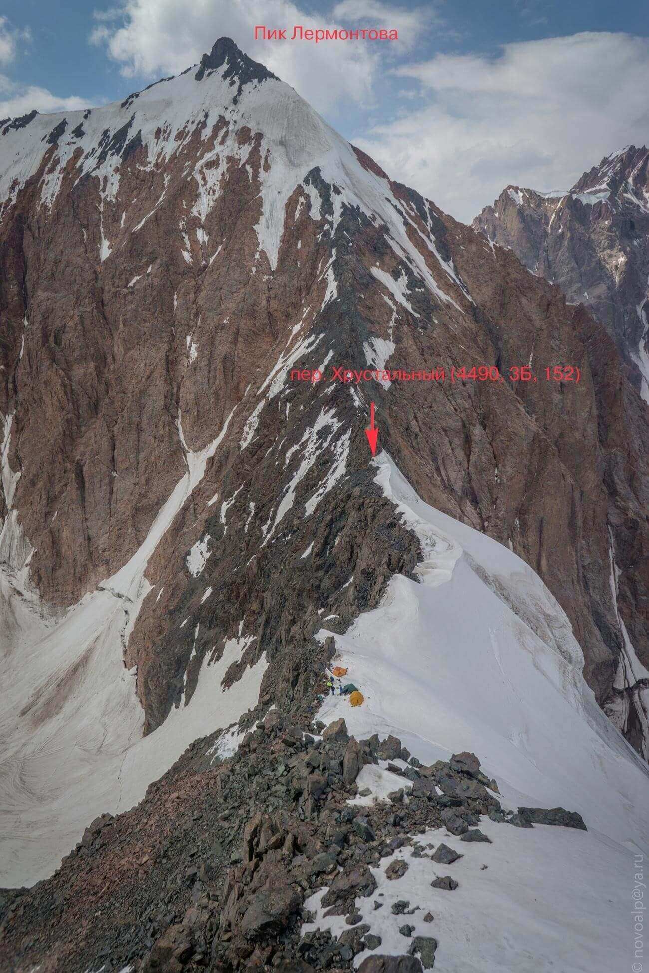 Рис 4.14. Вид на базовый лагерь и седловину пер. Хрустальный (4490, 3Б, 152).