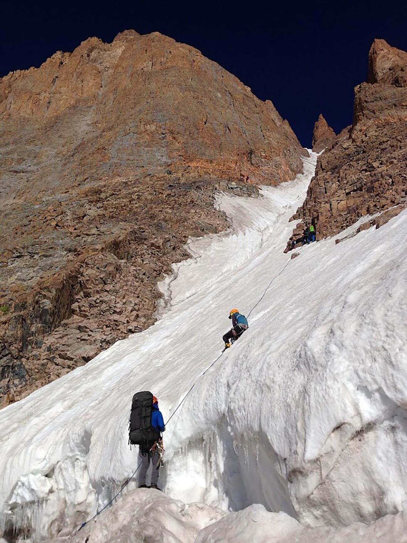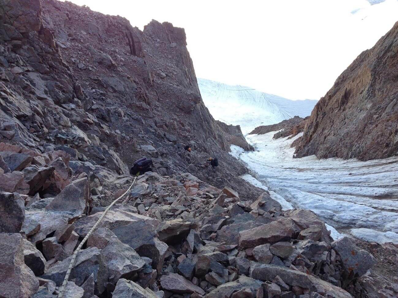 Рис 3.16. Последние полверевки при подъеме на седловину пер.Аламединская Стена(4340,3Б,216) с востока.