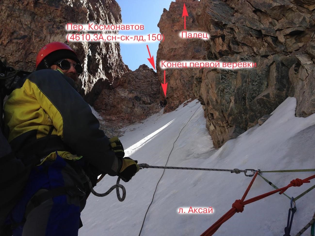 Рис 5.08 Спуск с перевала Космонавтов(4610,3А,сн-ск-лд,150) в сторону лед. Аксай. Провешено две веревки.