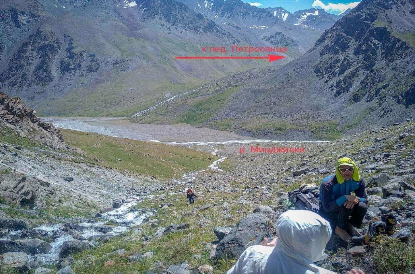 Рис 2.02. Подем вдоль реки под лед.Ленинградцев (Проценко В.) на оконечную морену, за которой находится озеро.