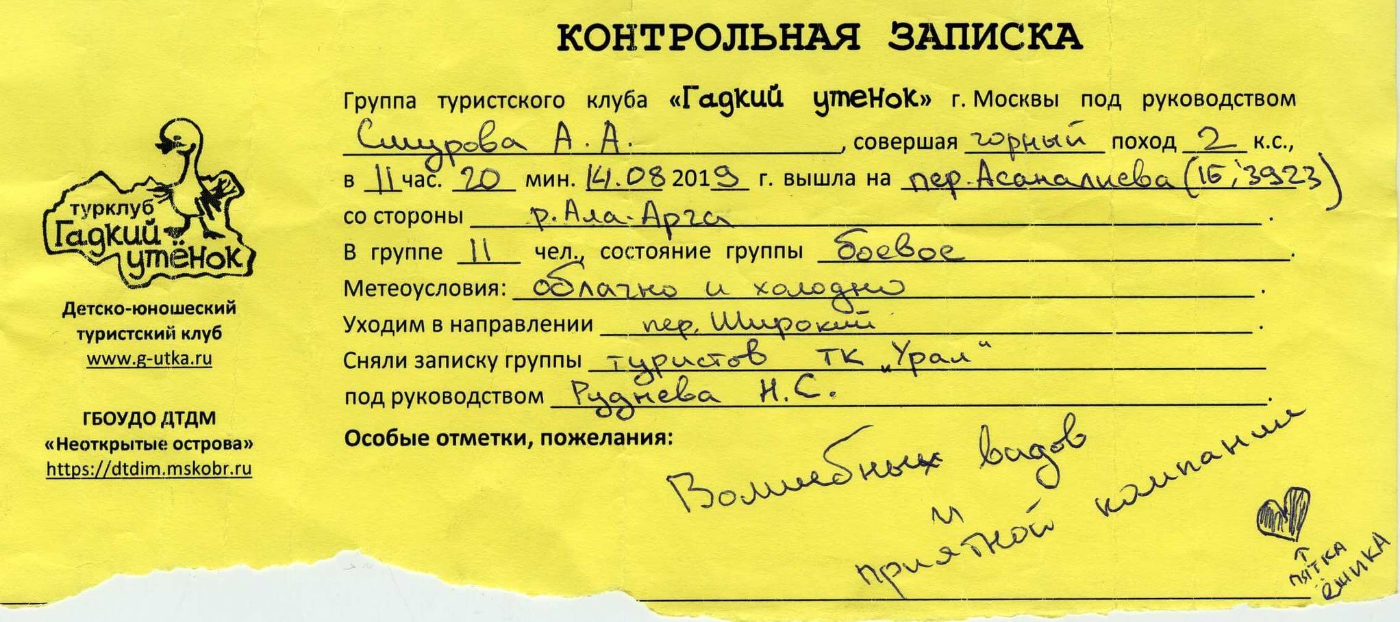 Рис 6. 10. Записка с перевала Асаналиева(3929,1Б,сн-ос,91).
