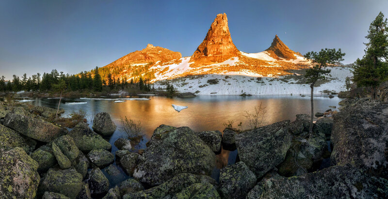 Спустившись в зону леса, мы целимся на озеро Художников. Дождь перестал. Мокрые ветки бьют по лицам. Одежда прилипла к телу, мы устали, перед нами крутой подъём… Но вдруг неожиданно стена лохматых кедров раздвигается, а в небо устремляются два пика: Толстый и Тонкий Братья. Заходящим солнцем осветило их макушки, и те забагровели на фоне фиолетового неба. Забыв обо всём, выхватываем фотоаппараты…