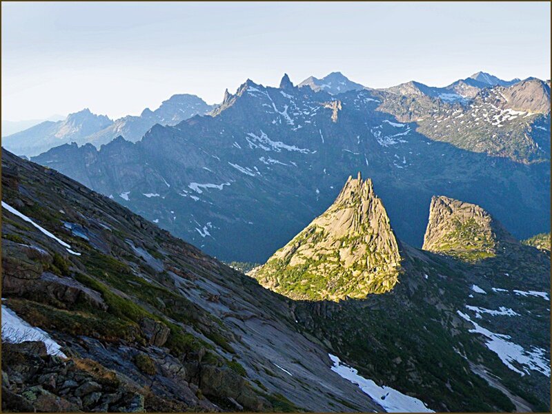 Накупавшись вволю в тёплом Радужном, мы пошли к голове Спящего Саяна. Перевал проходит через его затылок. Отсюда открывается вид на скалы Каменного Замка и Черепахи, а по другую сторону тянется крутая стена хребта Тайгиш. Над ней виднеются макушки самых высоких пиков: Зуб Дракона, Звёздный и Птица. Забравшись через час на перевал Тайгиш, мы оценили полностью всю панораму. Словно каменное море бушевало тут недавно. Ветром неслыханной силы вздыбило исполинские волны. И застыли они в мгновенье. Собственно, примерно так и было на самом деле. Много миллионов лет назад расплавленная магма под напором поднялась из недр земных и затопила полости в толще осадочных пород. В течение долгих веков ветрами и дождями мягкие породы размыло, а твёрдые остались в виде этих живописных утесов. Самый высокий и остроконечный пик – Звёздный. Словно ракета взлетает в небо, протыкая рыхлые тучи уверенным острием. Левый край Зуба Дракона словно по линейке вычерчен, до того ровная линия. Зато правым краем резко обрывается в бездонную пропасть. Пик Птица получил такое название не случайно: действительно, нахохлилась пернатая, и птенец рядом. На тёмном фоне выделяются небольшие пики Толстый и Тонкий Братья, а между ними пролегла знаменитая Парабола. Тут уж точно без лекала не обошлось. Картина остроконечных пиков и огромных гладких стен настолько фантастична, что дыхание перехватывает. Наша дружная пятёрка стонет от восхищения. Стремительно наползают коричневые рваные тучи. Быстро темнеет.