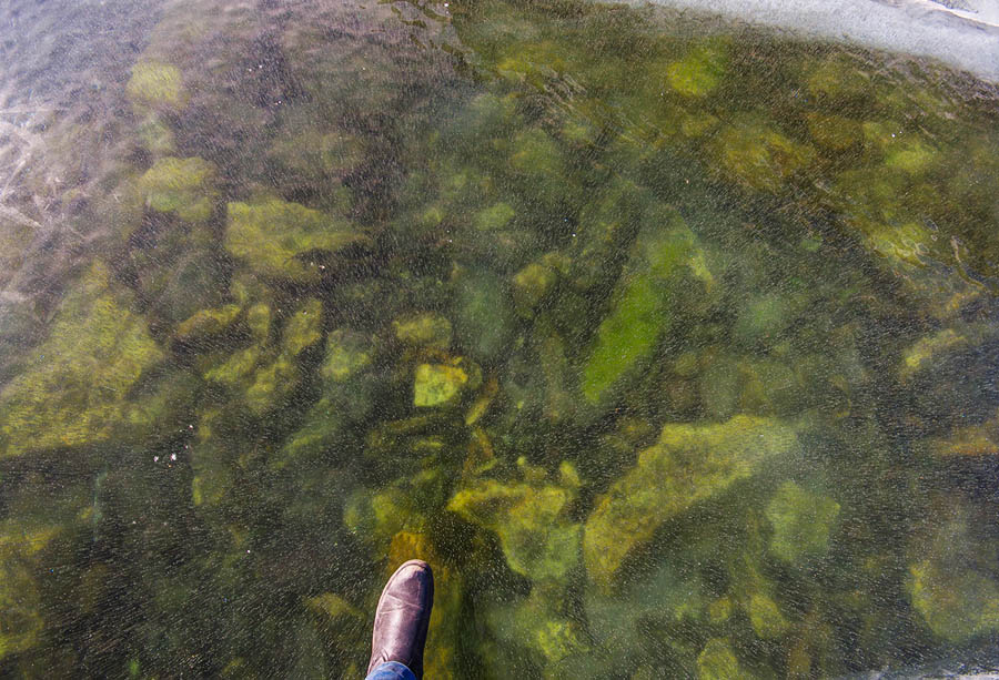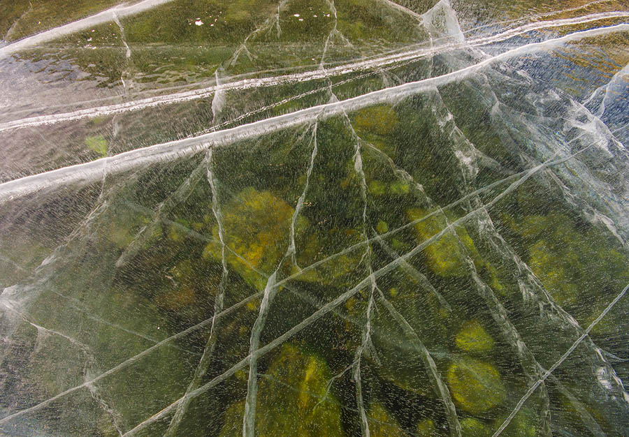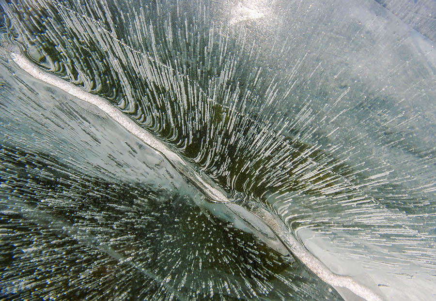 Толщина льда здесь в метр, но эти трещины уходят на глубину всего 30-40 см. Ниже молодой лёд без трещин.