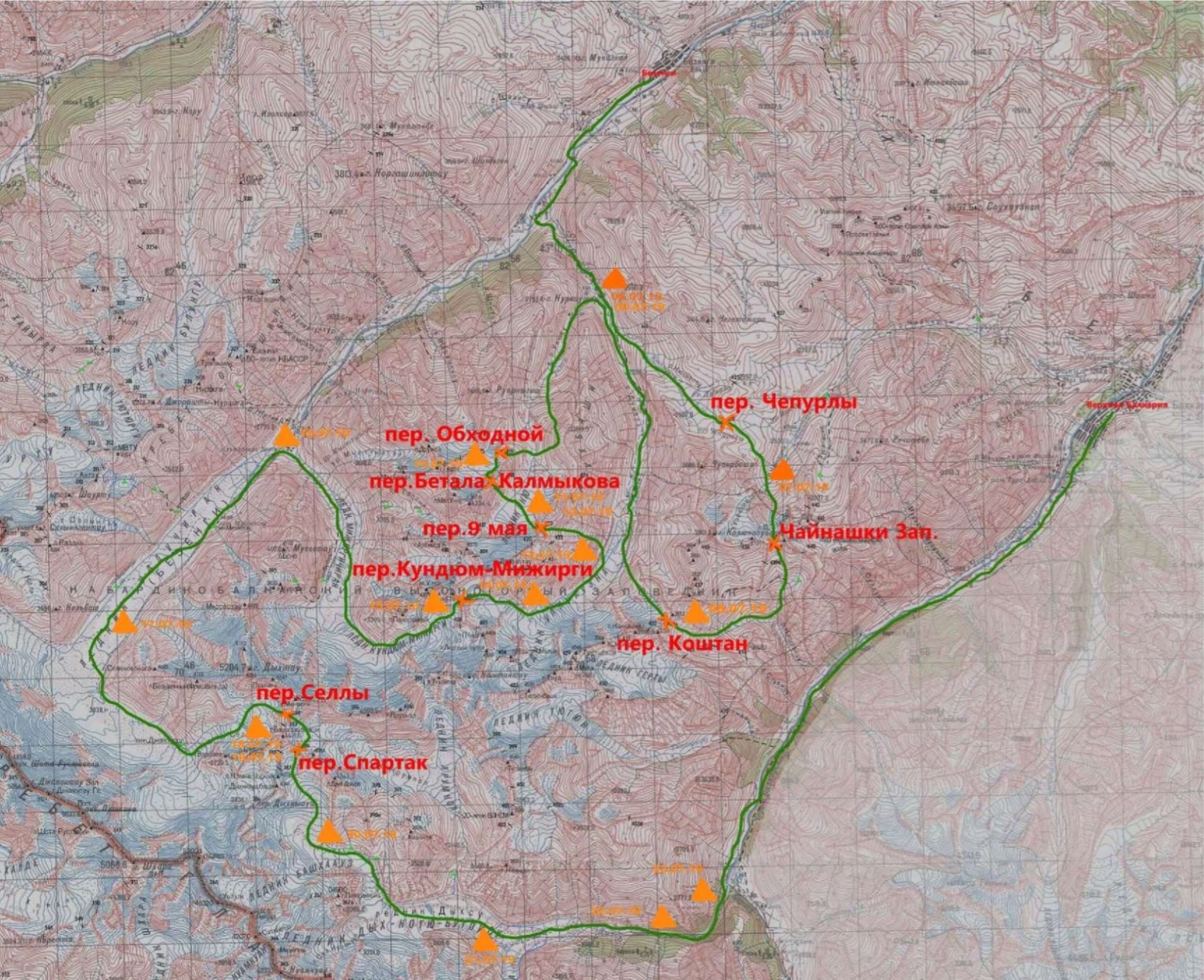 Фото 104 Альплагерь «Безенги». Связка3А: перевал Селлы (3А, 4449) и перевал Спартак (2А, 4231). Набор высоты: 2300 м. Потеря высоты: 3350 м. Описание дается: ота/л Безенги до п. Верхняя Балкария. Пройденное расстояние: 68км. Перевал Селлы (3А, 4449). Категория трудности: 3А Координаты: 43,039523°с.ш., 43,146178°в.д. Характер: снежно-ледовый. Ориентация: запад-восток. Расположен в хребте Перемычка Башхаауз-крест. Ведет с ледника Безенги на ледник Крумкол. Определяющие участки: подъем на перевал с западапо крутому сильно разорванному леднику. Применять перильную страховку на ледобурах. На перевале находится снежноледовые карнизы на восток. Спуск с перевала на восток по крутому (до 45 градусов) снежному кулуару, у подножия перевального взлета с восточной стороны есть засыпанные снегом трещины. С перевала снята перевальная записка группы туристов г.Костромы под руководством Кулагина Е.А. от 02.08.2015 года, совершавших горный поход 5 к.с. Перевал Спартак (2А, 4110). Категория трудности: 2А Координаты: 43,030190°с.ш., 43,150529°в.д. Характер: снежно-ледовый. Ориентация: юг-север. Расположен в хребте Перемычка Башхаауз-крест. Ведет с ледника Крумкол на ледник Башхаауз. Определяющие участки: Спуск с перевала на юг по крутому скально-осыпному склону и снежникам. Во второй половине дня южная сторона перевала лавиноопасна. С перевала снята перевальная записка группы туристов турклуба ТК МГТУ под руководством Алексея Чаплыгина от 11.07.2019 года, совершавших горный поход 4 к.с. 17 июля 2019 года, 12 день. (пройденное расстояние 11 км). Характерные точки ходового дня.
