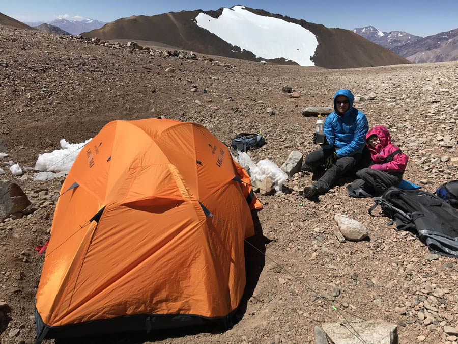 Во второй день мы поднялись на высоту 4200м, здесь уже закончилась зелень и Гуанаки и остались только камни, начались ледники. С утра и вечером воду было уже не набрать, но днем, когда солнышко выходило ручей от тающего ледника размораживался и живительная влага была в открытом доступе. Разбили лагерь и пошли прогуляться налегке до 4600-4800, и спустились в лагерь. Ночевка здесь уже была не очень комфортная голова болела у всех.