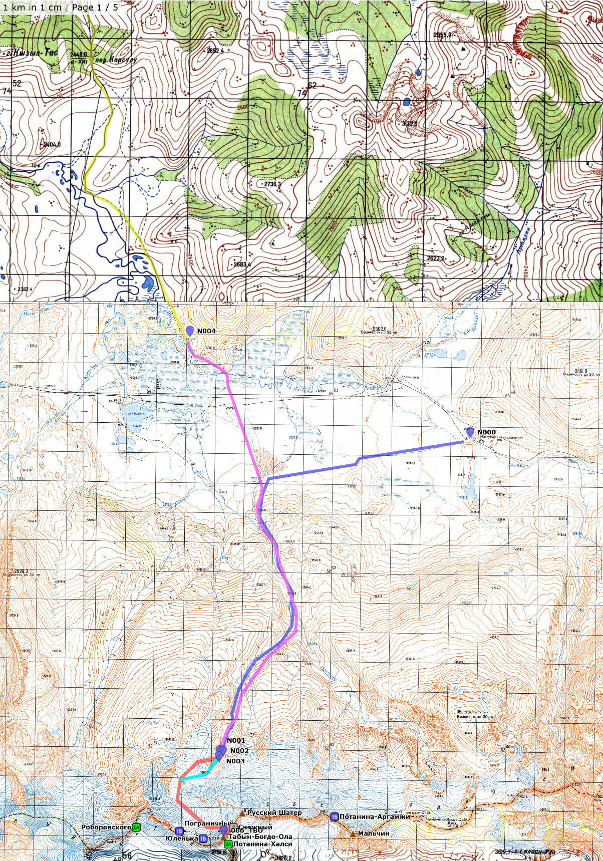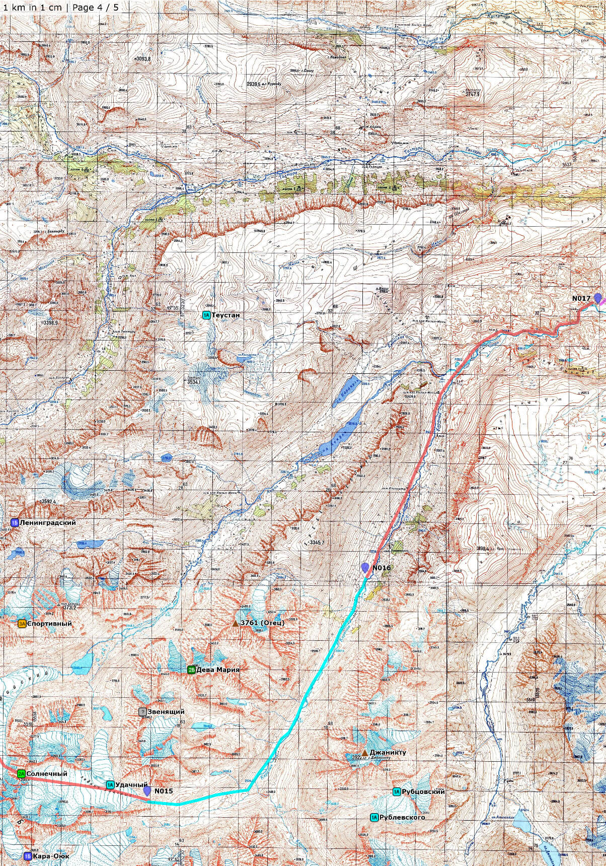 Подробная нитка маршрута пос. Кош-Агач - р. Калгуты- р. Аргамджи - пер. Снежный 2А - г. Табын-Богдо-Ола 2А - р. Аргамджи - - р. Калгуты - пер. Карсулу н/к - р. Акколь - р. Бугымуиз - пер. Бугымуиз н/к - р. Ильдегем - р. Джасатер -- р. Тюнь - пер. Тронова 2А - лед. Талдуринский - г. Икту 2Б - лед. Талдуринский - пер. Девяти 2Б - лед. Софийский - пер. Солнечный 2А - лед.Удачный - р. Караоюк - р.Чаган - п. Ортолык Определяющие препятствия маршрута