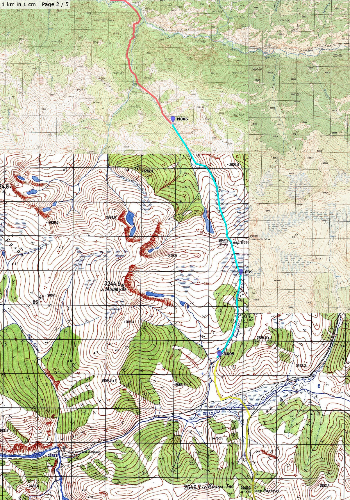 От моста через реку Тюнь поднялись к маральей ферме по крутому, но короткому участку дороги. Вход в маральник закрыт воротами и забором. Предварительно мы договорились с хозяевами маральника на проход по их территории, а так же получили несколько советов по пути до вершины Иикту. Дорога петляет среди леса и выводи к реке Узунгур(брод простой, по камням). Далее дорога движется по долине реки Узунгур. Идем по дороге в направлении восточного склона, где видны участки загона(забор)(как потом оказалось, от изгороди остались только столбы). Перед подъемом на склон пришлось перелезть через забор. От дороги по склону осталась только тропа и столбы. Траверсируем склон по тропе в направлении г. 2513.5., около отметки 2405,6 столбы заканчиваются, а тропа переходит в звериную и теряется. Спуск от г.2513,5 в долину р.Тюнь осложнен преодолением зарослей карликовой березки. Спустились к реке Тюнь в районе впадения ручья с перевала Обманутых надежд. Тропы нет, поднимаемся вверх по реке, вдоль реки заросли карликовой березки, несколько раз бродим р. Тюнь, брод от простого(по камням), до преодоления стенкой. Встаем на стоянку на левом берегу под большим камнем, там есть ровная площадка на 1 палатку.