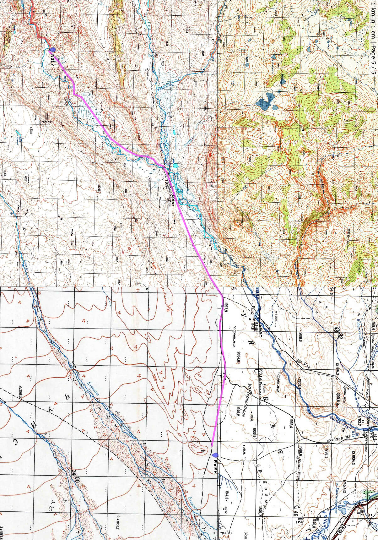 Продолжаем спуск по тропе по левому берегу р.Караоюк. Постепенно тропа превращается в дорогу, проходим несколько кошей, в некоторых есть пастухи, можно купить мясо и хлеб. На слиянии р.Аккол и Чаган обедаем. Дорога уходит влево на отрог, а мы по конной тропе идем вниз по реке Чаган. Ниже отметки 2109,6 и коша слевой стороны река уходит в каньон, движение по нему возможно. В первой части тропа идет вдоль левого берега реки, затем необходимо перейти на правый берег(брод стенкой, глубина 0,6, ширина больше 10 метров) далее прижим обходиться скалам правого берега, а потом снова вернуться на левый берег и вдоль скал левого берега выходим к дому с хозяйственными постройками. Дом жилой. В километре от дома на травянистой полянке встаем на стоянку. Дров нет.