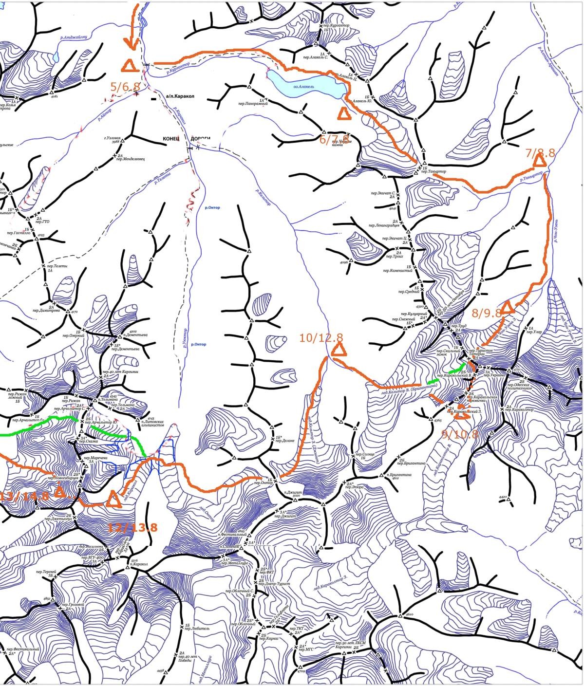 Техническое описания прохождения маршрута 2018.08.05. Переезд в Каракол и подъем до альплагеря “Каракол” (17 км, +740). В 4 утра прилетаем в Алматы, получаем багаж и проходим паспортный контроль. Перед зданием аэропорта нас уже ждет водитель “”. Мы покупаем воду в небольшом магазинчике через дорогу от аэропорта, грузимся и выезжаем на Каракол, в прошлом Прожевальск. Дорога бежит сначала на восток вдоль отрогов Заилийского Алатау а затем поворачивает на юг к Иссык-Кулю. Калейдоскопом сменяются необыкновенной красоты горные и пустынные ландшафты, но большинство участников нагоняет недостаток ночного сна. Просыпаемся чтобы посреди окаймленной далекими горами степи пройти паспортный контроль при пересечении границы с Кыргызстаном. Вскоре после этого дорога входит в Боамское ущелье и асфальтовое покрытие на некоторое время пропадает - пыль стоит столбом. Далее путь ведет на запад вдоль южных отрогов Кунгей-Алатау - к одному из самых больших высокогорных озер мира, Иссык-Кулю, и, огибая Иссык-Куль, к Караколу. В Каракол приезжаем в 13.00. Оставляем в кемпинге “Туркестан Юрт Кэмп” мобилы, городскую одежду и все что нам не понадобится в горах. В 14.00 начинаем наш путь вверх по ущелью Каракол. Стартовая высота 1800 м., погода отличная. Грунтовая дорога тянется по склонам долины высоко над рекой. Кусты сменяются лиственным лесом, а затем в конце концов появляются знаменитые тянь-шаньские ели. Уже по темноте, в 9 вечера выходим к альплагерю Каракол выше впадения в р. Каракол ручьев Айтор и Кургактор. Высота 2540 м. За символическую плату останавливаемся на территории альплагеря. 2018.08.06. Подъем по ущелью р. Кургактор, оз. Алакель (9 км, +1100, -106).