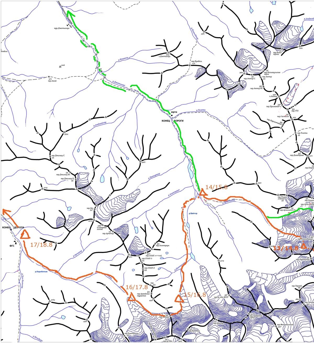 Справочные сведения о путешествии. Заявленная нитка маршрута: Пос. Каракол – р.Караколтор – р.Кургактор – пер. Такыртор (1Б, 4040) – р. Такыртор – р.Чон-Узень – траверс (2Б)(пер. Туристов Татарии(2А, 4400) – пер. Каракольский В.(2Б, 4450) – пер. Каракольская перемычка (2Б, 4350)) – пер. Каракольский З. (2А, 4200) – р. Кельтор – пер. Онтор(1Б, 3900) – р. Онтор – пер. Новосибирцев (2Б*, 4257) – р.Арчалытор – р. Байтор – р. Джетыогуз – пер. Айлама (2Б, 4065) – р. Айлама – р. Карабаткак – р. Чон-Кызылсу – пос. Кызыл-Суу Картографический материалКраткие сведения о путешествии Вид путешествия – горное. Категория сложности – четвертая. Район путешествия – Терскей-Алатау. Время проведения путешествия – 4 августа - 20 августа 2018 года. Способ передвижения – пешком. Продолжительность маршрута – 135 км. Пройдено перевалов – 2Б к.с. – 3, 2А к.с. – 1, 1Б к.с. – 2, Всего – 6. Продолжительность путешествия – 17 дней (из них полных ходовых дней – 13). Количество полевых ночлегов – 14 (на леднике, на перевале – 3). Путешествие рассмотрено в МКК ХГКТ. Номер маршрутной книжки – 25-2018г. Количество участников – 5. Общий вес груза на маршруте 142 кг. Вес продуктов питания 42 кг. Максимальный расчетный вес рюкзака при выходе на маршрут у мужчин – 30 кг, у женщин – 23 кг. Список группы