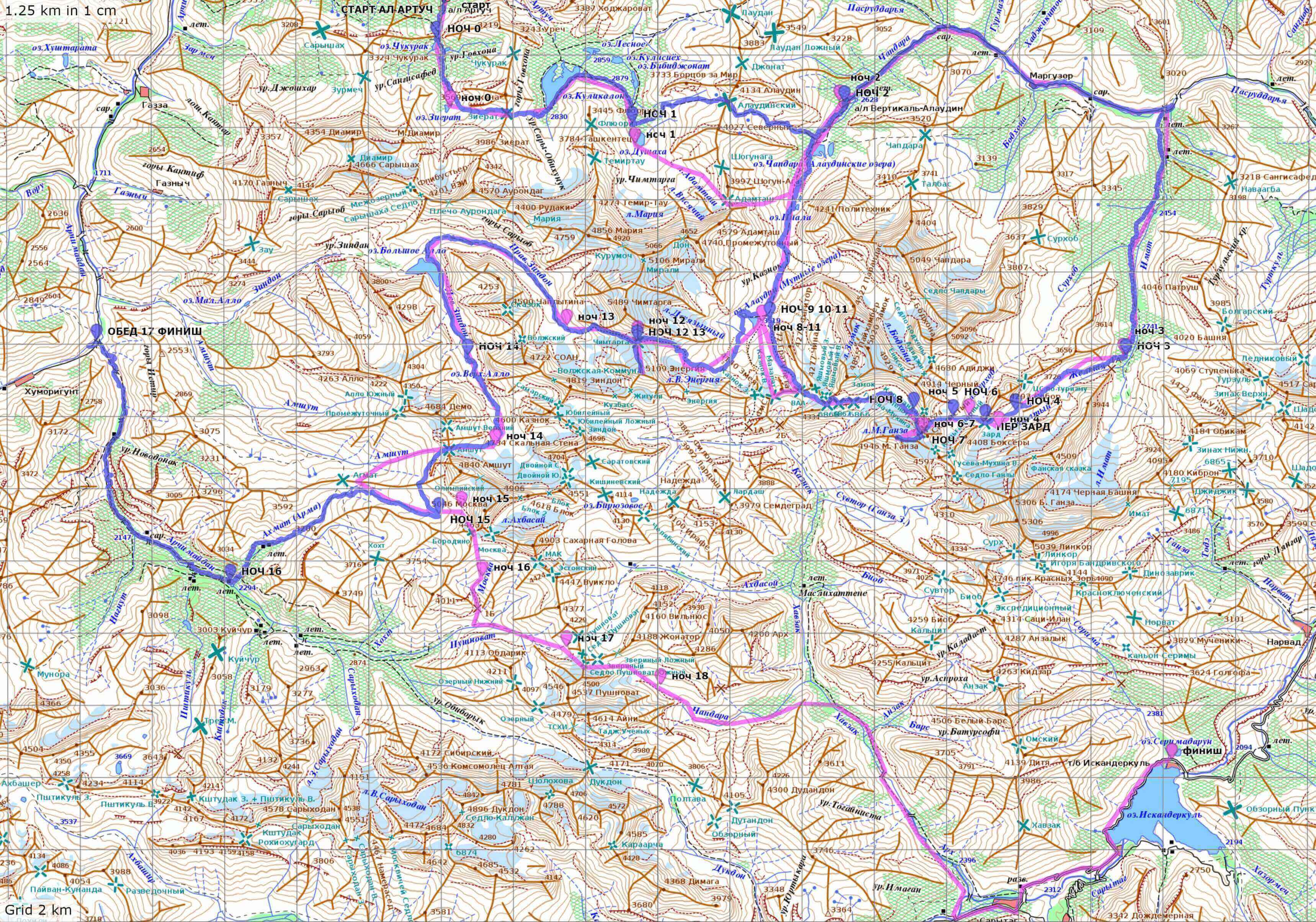 Нитка маршрута: а/л Артуч - пер. Зиерат (1А) - пер. Алаудинский (н/к) - а/л Вертикаль-Алаудин - р. Имат - р. Жёлтая - пер. Зард (2А) - пер. Зеленоград+Гусева- Мухина З.+в. М. Ганза(рад) (2А) - пер. ВАА (1Б) - оз. Мутные - а/л Вертикаль-Алаудин (рад) - пер. Чимтарга+в. Энергия(рад) (2А) - оз. Б. Алло - пер. Амшут (1Б) - р. Агмат - р. Арчимайдан до устья р. Сарымат