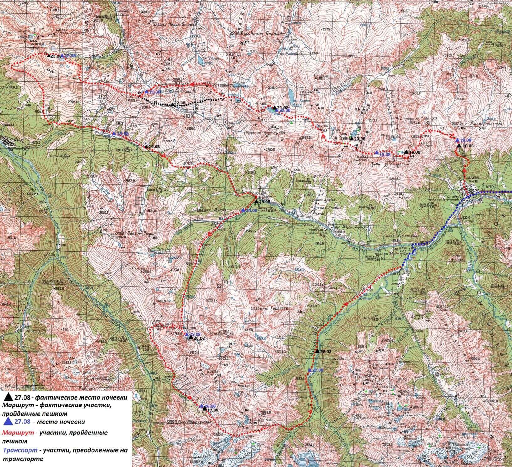 Пройденный маршрут пос. Архыз - водоп. Баритовый - траверс 1Б [пер. Баритовый (1А, 2809) - пер. Архыз (1А, 2970) - п. Пионеров (3056 м) - пер. Грозовой (1Б, 2843)] - оз. 2609 - пер. Московский (1А, 2865) - пер. Турий (1Б, 2971) - оз. Турье (3056) - связка перевалов 1А [пер. Агур 2968 - пер. Мылгвал 2848] - оз. Лазурное - пер. 17-ти (1Б, 2956) - пер. Речепста (1А, 2892) - д.р. Речепста - пер. Речепста-Пхия (н/к, 2796) - пер. Ацгара Верхний (1А, 2726) - траверс Загеданского хребта - оз. 2430 - пер. Надежда Ацгарский (1Б, 2500) - р. Верхняя Пхия - д.р. Пхия - пер. Пхия (н/к, 2162) - р. Речепста - р. Дукка - р. Большая Дукка - оз. Семицветное - пер. Дукка (н/к, 2637) - д.р. Большая Лаба - р. Бурная - пер. Браконьеров (1А, 2831) - оз. 2788 - р. Аманауз - р. Псыш - пос. Архыз Определяющие препятствия маршрута