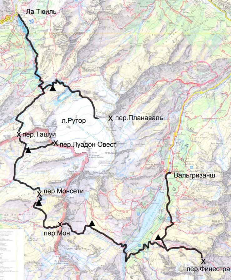 Список использованных в отчёте сокращений. Топонимика. к.с. – категория сложности (похода), 1А,1Б – категории трудности перевалов Рад. – радиально Дол. – долина н/к – некатегорийный (перевал) Л. – ледник Верш. – вершина Пос. – поселок Пер. – перевал Оз. – озеро Р. – река, ручей ХХХХ м – высота над уровнем моря AV2 – тропа Alta Via 2 НГК –Нижегородский горный клуб ЧХВ – чистое ходовое время Х:ХХ – часы иыминут ЧХВ (если не указано иное) Географические названия в отчёте в основном даны на русском языке (источники: карта Генштаба, русскоязычные отчёты о походах). Большую часть названий мы посчитали нужным привести также и в оригинале (на итальянском или французском языках, в соответствии с их написанием на картах и непосредственно на местности). Следует отметить, что в приграничных (с Францией) районах Италии существует как итальянская, так и французская топонимика. Даже можно встретить разные (написанные или по-итальянски или по-французски) названия одних и тех же географических объектов на разных итальянских картах. Общие сведения о путешествии Вид туризма – горный Категория сложности – первая с элементами второй Район – Грайские Альпы (Италия, Франция) Количество ходовых дней – 9 Протяженность: 95 км Пройдено перевалов – 5, в т.ч. н/к – 1, 1А – 3, 1Б – 1 Максимальная высота – 2922 м, максимальная высота ночевки – 2460 м Число участников – 6 Маршрутная книжка № 3/14, выдана МКК Спортивно-оздоровительного комплекса «Электросталь», Московская область, г. Электросталь Руководитель: Стома Александр Валериевич, г. Рязань Пройденный маршрут: пос. Вальгризанш – дол. Иль Бук – пер. Финестра (1А, 2840 м) (рад.) – дол. Дора ди Вальгризанш – дол. Гранд Aльпе – пер. Мон (1А, 2639 м) – оз. Нуар – пер.Монсети (н/к, 2550 м) – дол. Сассьер – оз. Пти – пер. Луадон Овест (1Б, 2922 м) (рад.) – пер. Ташуи (1А, 2671) – дол. Белла Комба – оз. Гьяччайо – боковая морена л. Рутор (рад.) – дол. Рутор – пос. Ла Тюиль