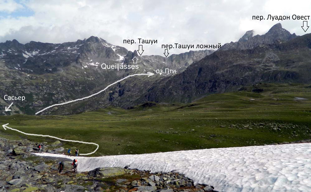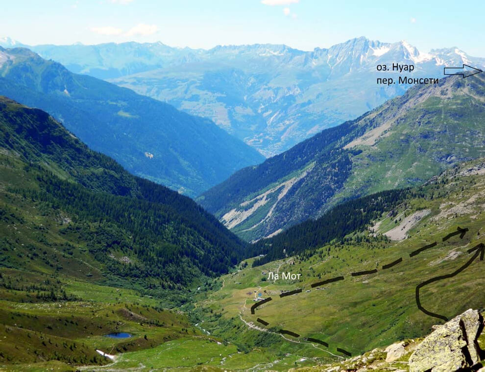Фото 10. Вид со стороны пер. Мон на запад. Сплошной линией показан наш путь к оз. Нуар, пунктиром – рекомендуемый.