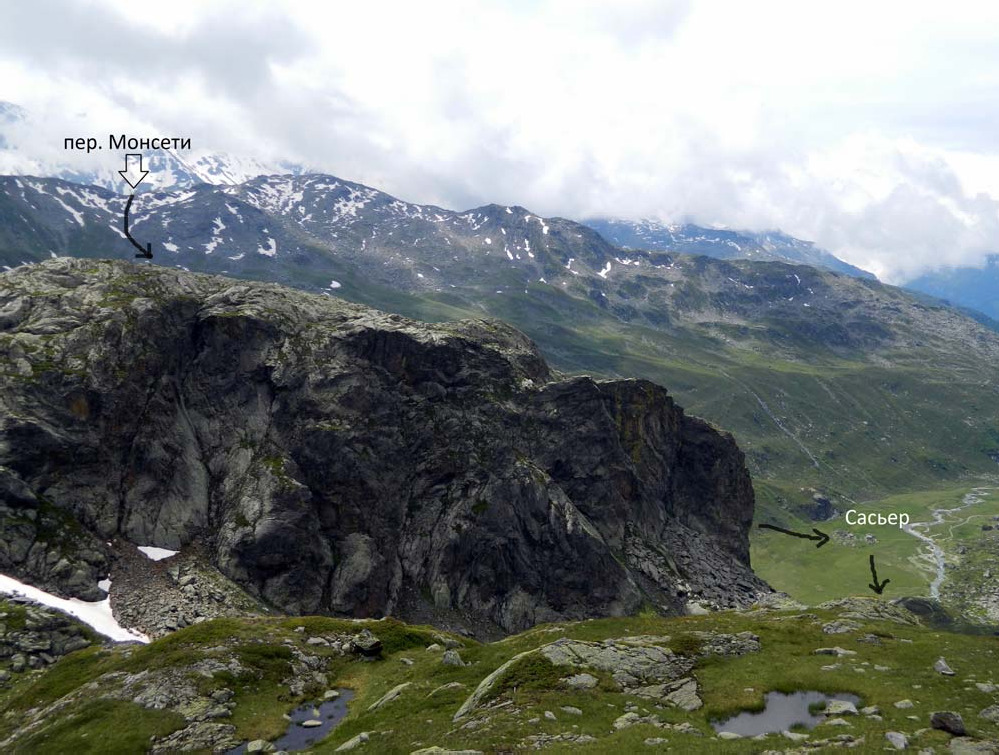 Фото 11. Перевал Мон, вид с оз. Нуар 4июля (5-й день). Оз. Нуар – перевал Монсети (Montseti) (н/к, 2550 м) – дол. Сасcьер (Sassiere) – оз. Пти (Lac du Petit) Пошли дальше вверх по маркированной тропе. На следующей старой моренной ступени, под самым перевалом, обнаружили уже «настоящее» озеро Нуар, более красивое и суровое. Чуть выше озера – перевал Монсети. От стоянки до перевала поднялись за 15 мин. Взлёт травянистый с выходами скал, до 30°, хорошая тропа. Седловина представляет собой небольшое понижение в невысоком западном отроге верш. Gran Becca du Mont. На севере над широкой зеленой долиной тянется хребет, в одном из цирков которого спряталось озеро Пти и наш следующий перевал Ташуи (фото 12). Спуск на север пологий, в верхней части осыпь до 20°, ниже – луг, поросший рододендронами. Крутизна травянистого склона наибольшая в нижней части. Везде четкая тропа. За час спустились на ровное широкое дно долины. Перед деревней Сасьер перешли ручей по мосту. Деревня – несколько каменных изб, людей нет. За деревней направо ещё мост, перешли по нему на правый берег речки Сасьер, вытекающей из озера Пти. За мостом вышли на маркированную тропу, круто поднимающуюся вдоль речки по травянистому склону с участками крупной и средней осыпи. В конце подъема – скальные прижимы. За два часа поднялись до озера Пти, которое встретило нас штормовым ветром с зарядами дождя. Рядом ещё одно озерцо поменьше (фото 18), с более уютными местами для ночевки, где мы и поставили лагерь. С возвышенности над озером на юге просматривается пройденный пер. Монсети (фото 13).