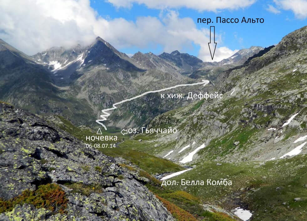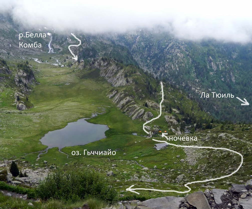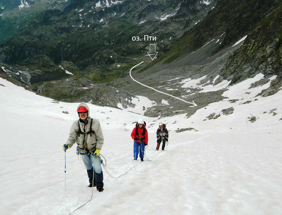 Фото 17. Прохождение снежного взлёта пер. Луадон Овест (спуск) 6июля (7-й день). Озеро Пти – перевал Ташуи (Tachuy) (1А, 2671 м) – озёра и долина Белла Комба (Laghi di Bella Comba) – р. Рутор – озеро Гьяччайо (Ghiacciaio) Глядя на цирк оз. Пти от южного края озера, кажется, что пер. Ташуи находится прямо над озером на севере. Однако подъем к этой седловине смотрится слишком уж сложным и крутым для перевала 1А. Но именно эта точка отмечена как перевал Ташуи туристами НГК на их фото. Однако маркированная тропа от озера следовать именно ей, выводит не к этой седловине (на наших фото мы обозначили её как «пер.Ташуи ложный»), а к истинному перевалу Ташуи, который расположен левее, в западной части цирка и скрыт за небольшим отрогом, увенчанным башней Queillasses (см. фото 12). Однако с нашей стоянки на малом озере Пти он виден хорошо (фото 18). Абсолютная высота пер. Ташуи на разных картах имеет некоторые разночтения: на новых картах – 2671 м, на старых – 2673 и 2693 м. Встали на основную тропу у южной оконечности оз. Пти, прошли по большим камням вдоль его западного берега. Затем тропа меняет общее направление с северного на западное, уходит налево в распадок и резко набирает высоту. Перевальная точка снизу не читается. После выполаживания подошли под осыпной перевальный взлёт (средняя и мелкая осыпь, тропа) крутизной до 40° и высотой около 100 м (фото 19). На перевал поднялись с небольшим траверсом вправо. От стоянки до перевала 1,5 часа хода. Вид с перевала назад (на юго-восток)– фото 20. Перевальная седловина относительно широкая, протяженная (фото 21). На севере надеялись увидеть Монблан, но весь его массив был закрыт облаками. Здесь мы покидаем Францию и возвращаемся в Италию. Северный склон перевала в верхней части почти сплошь покрыт снегом, из под которого местами торчат каменистые и скальные островки (фото 22). Идем вначале вниз-вправо к группе озёр Ташуи. Выбираем склоны поположе, двигаясь по снегу от одного каменного островка к другому. Есть туры. Крутизна не более 30°, снег рыхлый, держит хорошо, самостраховки достаточно. Ниже озёр Ташуи снега значительно меньше, склон в основном травянисто-осыпной. Нашли хорошую тропу, ведущую влево-вниз к озёрам Белла Комба. По нейобыстр спустились и через перешеек между озёрами перешли на левый борт долины. Вид отсюда на пер.Ташуи – фото 23, вниз на дол. Белла Комба – фото 24. От перевала шли 1:40. Здесь уже царство альпийских лугов. Еще через 0:50 тропа привела к хорошей обзорной точке с видом на Монблан, как раз немного показавшийся из-за облаков. Прямо внизу – обширная зелёная котловина, где сливаются р. Рутор, стекающая из ледниковых озёр и р. Белла Комба (фото 25). Поскольку тропы, идущей без потери высоты в сторону л. Рутор (о которой писали нижегородцы), мы не увидели, то поняли, что придётся спускаться в котловину и уже оттуда по магистральной тропе AV2 подниматься к леднику. Спустились к мосту (25 мин) (при этом решили срезать, но как это обычно бывает, тропа потерялась лучше идти левее по основной тропе как показано на фото 25), перешли на правый берег р. Рутор и по лесной тропе вышли на AV2 (10 мин). По ней немного поднялись (15 мин) к озеру Гьяччайо (или Lago Glacier), находящемуся в северной части вышеупомянутой зелёной котловины. Рядом – добротный домик с замком на двери. Поскольку кончался световой день и начинался дождь, остались на ночевку в этом месте (по плану должны был