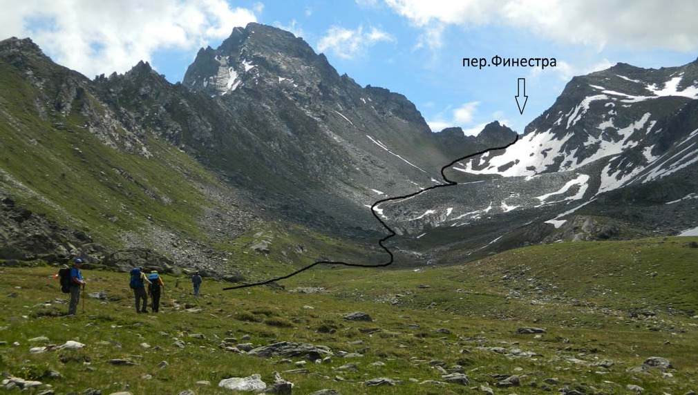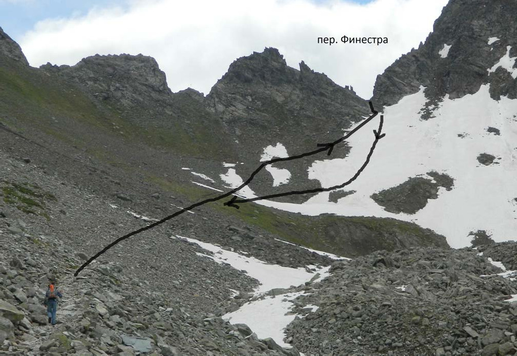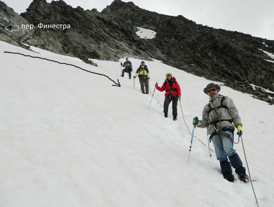 Техническое описание, фото 30июня (1-й день). Пос. Вальгризанш – р. Иль Бук (Il Bouc) в районе хижины Ипи (Chalet de IEpee) От Вальгризанша до перевала Финестра на маршрут совпадал с магистральным треком Alta Via 2 (AV2), поддерживаемом в отличном состоянии. Тропа промаркирована желтыми полосами или стрелками, периодически встречается желтая цифра «2» в треугольнике. На узловых точках тропы встречаются таблички с указанием, сколько времени идти до различных объектов интереса. Надо учитывать, что обозначенное там время соответствует передвижению достаточно тренированных лиц налегке. При ходьбе с тяжелым рюкзаком его надо умножить как минимум на 1,2-1,3. От Вальгризанша по шоссе прошли 0,5 км до следующей деревушки Монданьес (Mondanges). Перед тоннелем свернули налево на грунтовку (есть указатель), перешли по мосту реку, обогнули слева футбольное поле и вошли в лес. Дорога переходит в тропу, начинается хороший набор высоты. Через 2 часа хода (здесь и далее – ЧХВ, если не указано иное) – разрушенные избы, обширная луговина, открываются отличные виды. Через 20 мин прошли добротные фермы, затем перешли по камням довольно крупный ручей - видимо, Pra Longet. Покинули зону леса. Через час, выйдя на перегиб склона в долину Иль Бук, увидели впереди хижину Ипи. Решили дальше не идти и встать на ночёвку вне прямой видимости от хижины. Нашли хорошее место под одинокой сосенкой метрах в 100 от тропы справа, прямо на краю обрыва в глубокую долину к озеру Борегар (Beauregrd) (место ночевки показано на фото 08). За водой пришлось идти назад по тропе к ближайшему ручейку (минут 10). Зато виды отсюда просто потрясающие! 1июля (2-й день). Радиальный выход на перевал Финестра (Finestra, Fenetre) (1А, 2840 м) Вышли на тропу, быстро дошли до хижины. От нее преодолели крутой, но короткий подъем на моренную ступень. Дальше до подножия перевала простирается троговая долина с небольшим уклоном, покрытая великолепным цветущим альпийским лугом. Перевал просматривается очень хорошо на востоке (фото 01). Тропа периодически подходит к реке. Взлёт около 200 м, осыпной (средняя и мелкая осыпь), в верхней половине – снежник. Тропа заходит на седловину с левого по ходу борта, крутизна увеличивается по мере подъема, в конце до 35° (фото 02, 03). При подъеме снежник обошли по осыпи слева и только последние метров 20 прошли по раскисшему снегу (угрозы соскальзывания не было, достаточно самостраховки). От стоянки поднялись на перевал за 1:40. Седловина узкая, короткая. Восточный склон перевала смотрится немного покруче. Отлично виден пер. Мон на западе (фото 03). На снежнике устроили занятие на передвижения по снежным склонам. Спускались обратно вначале по снежнику почти до его конца (100 м) в связках (также в основном с учебной целью) (фото 02-04). Затем быстро «добежали» до лагеря. Возвращение заняло 1:10.