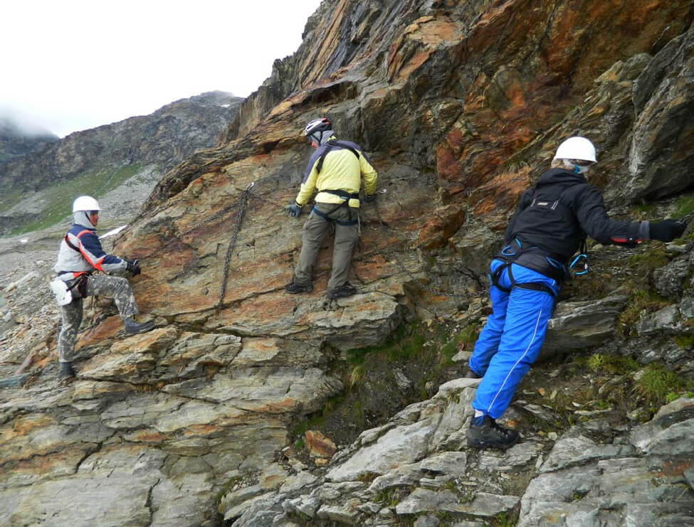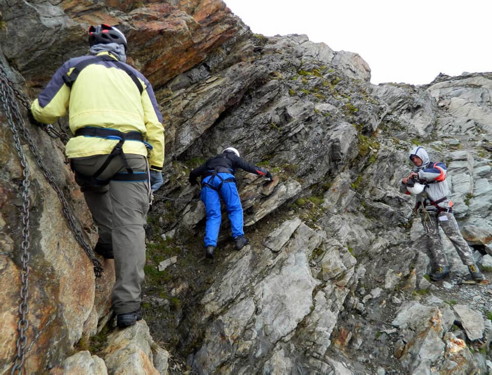 Фото 25. Стрелка р. Белла Комба и Рутор 7июля (8-й день). Радиальный выход на боковую морену ледника Рутор Поскольку вчера не удалось подняться ближе к леднику, цель радиального выхода пришлось скорректировать. Вместо прохождения ледника до пер. Рутор программой-максимумом стала разведка пер. Планаваль (Planaval), то есть подход под его взлёт, а также выход на л. Рутор. От стоянки у оз. Гьяччайо (фото 26) по тропе AV2 (крутой склон, серпантины) поднялись к хижине Деффейс (Deffeyes) (фото 27) за час, набор высоты около 350 м. У хижины – развилка троп (есть указатели): а) на северо-восток – на пер. Пассо Альто (Passo Alto) (вероятно не труднее 1А) – основной и более простой вариант тропы AV2 б) на юго-восток – на пер. Планаваль (вероятно 1Б, по итальянской классификации – ЕЕ) – более сложный вариант (поэтому на новых картах AV2 вообще обозначена только через Пассо Альто). Перешли по мосту ручей, через полчаса миновали оз. Верде (Lago Verde), затем еще небольшое озерцо. Подъем в целом плавный. Дальше пошли старые моренные холмы с выходами скал, среди которых было бы трудно находить верный зпуть бе маркировки. Пробравшись через этот лабиринт, вышли на небольшой перевальчик (50 мин от хижины), откуда открылся грандиозный вид на ледник, верхняя часть которого, впрочем, была скрыта облаками (фото 28). Отсюда тропа повела нас влево-вниз в долинку ручья, который перешли по камням. После ручья поднялись на боковую морену ледника слева от его языка. Вскоре подошли к месту, где в морену слева вклинивается скальный массив с почти отвесно уходящими вверх стенами. Траверс этого участка проходит по узким скальным полкам. Для страховки здесь оборудована «via ferrata» (стационарные металлические перила в виде толстой цепи) – два участка примерно метров по 20-25. Надели страховочные системы и каски. Прошли эти участки с дополнительной самостраховкой, пропуская цепь через карабин грудной обвязки, перестёгиваясь в точках закрепления перил (фото 29, 30). Погода, начавшая хандрить с утра, испортилась окончательно. Дождь уже не прекращался и нас накрыло облако (видимость резко ухудшилась). Прошли по морене до поворота тропы на восток к пер. Планаваль, достигнув высоты около 2800 м). От стоянки шли сюда 3,5 часа. Ни перевала, ни ледника не видно, туман усилился, сильный ветер. Выход на ледник в таких условиях особого смыла не имел, не говоря уже о небезопасности такой затеи. Повернули обратно и тем же путем спустились в лагерь за 2:15.