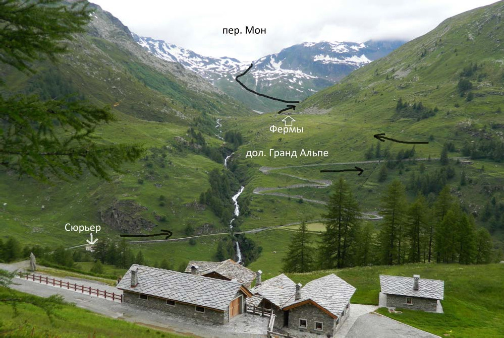 Фото 04. Начало спуска с пер. Финестра 2июля (3-й день). Дол. Иль Бук – дол. Дора ди Вальгризанш – дол. Гранд Альпе От хижины Ипи на дно долины Дора ди Вальгризанш ведёт грунтовая дорога, спускающая серпантнами к деревушке Сюрьер (Surrier) по крутому лесистому склону. Шли то по дороге, то по тропе, срезающей серпантины. Ближе к концу спуска миновали небольшой водопад. Перед мостом через Дору начинается асфальт. Спуск занял полтора часа. От Сюрьера поднялись по серпантинам шоссе, ведущего в Вальгризагнш, на устьевую ступень долины Гранд Альпе, свернули налево на грунтовку к фермам (1 час от Сюрьера) (фото 05). От ферм надо идти верхом по дороге (видна на фото 08), траверсируя правый по ходу борт долины не следует сваливаться налево к руслу реки. За дальней фермой дорога кончается, тропа плавно поворачивает в долину ручья, стекающего из цирка с озером Сан Грато. Дошли до моста через ручей – места, где и должна быть по плану сегодняшняя стоянка с видом на водопад. От Сюрьера 1:40.