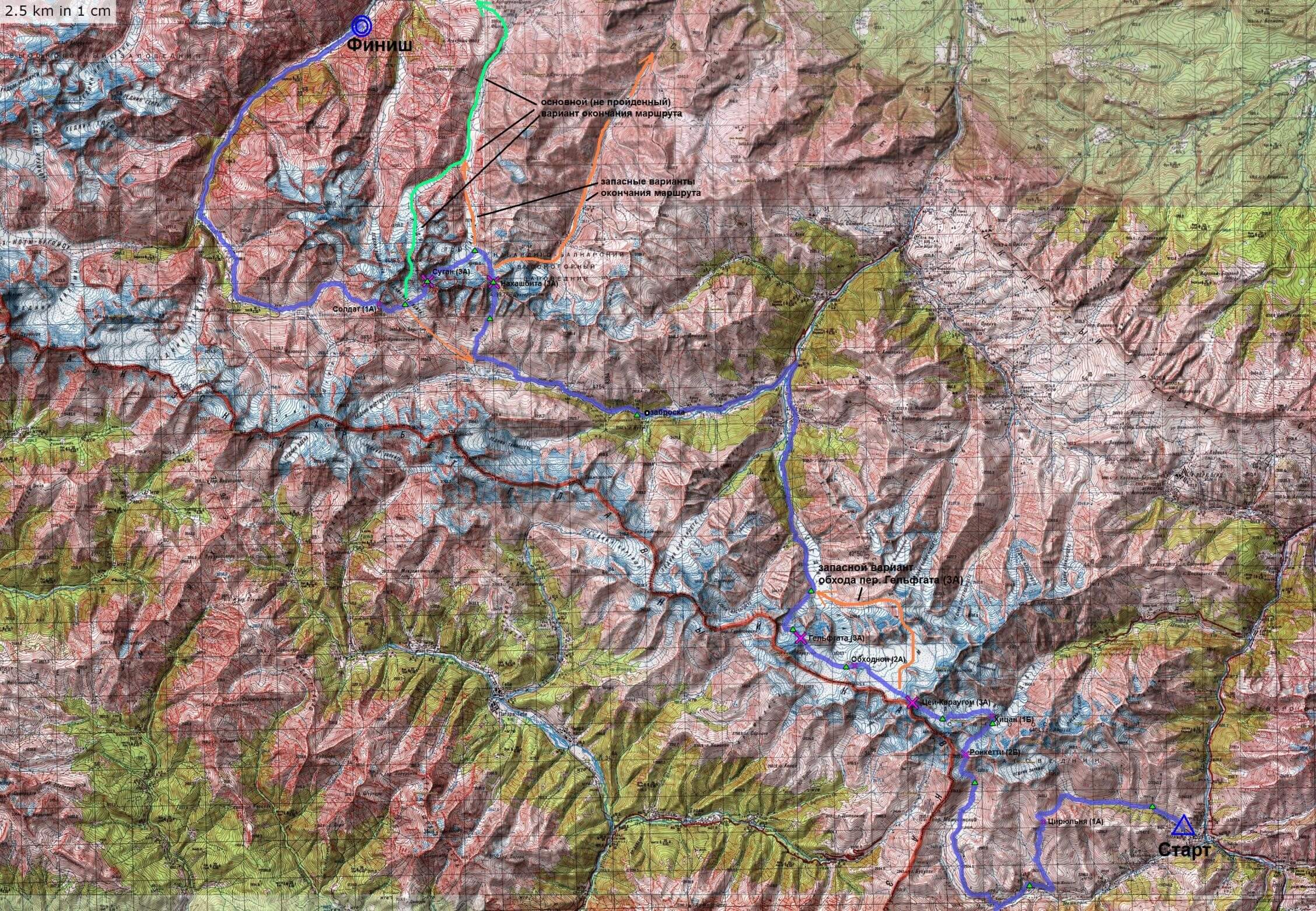 Рисунок 21. Путь группы через пер. Ронкетти (2Б) и Хицан (1Б). Масштаб 500 м в 1 см. Подъём дежурного в 3:00, выход в 5:00.
