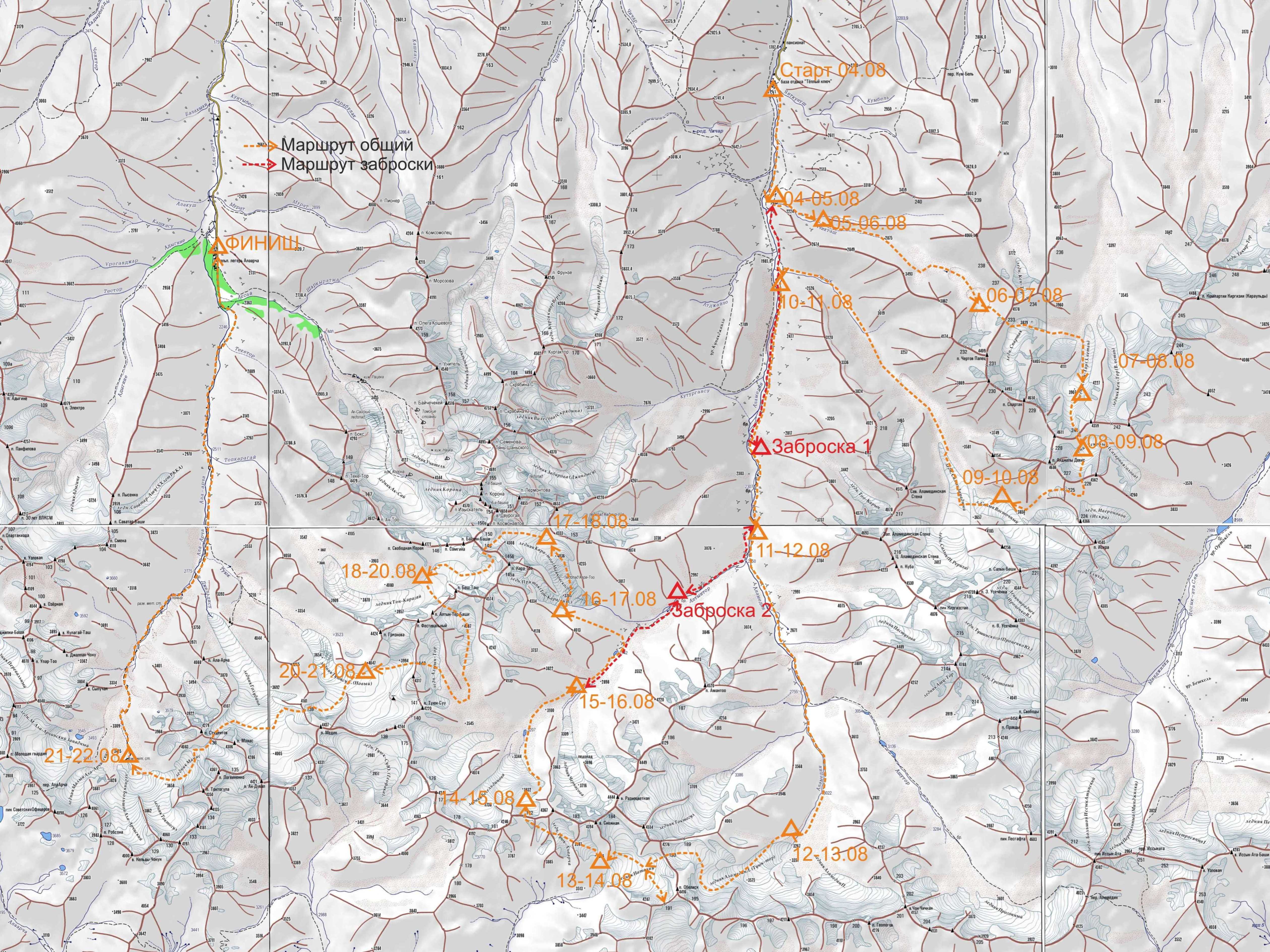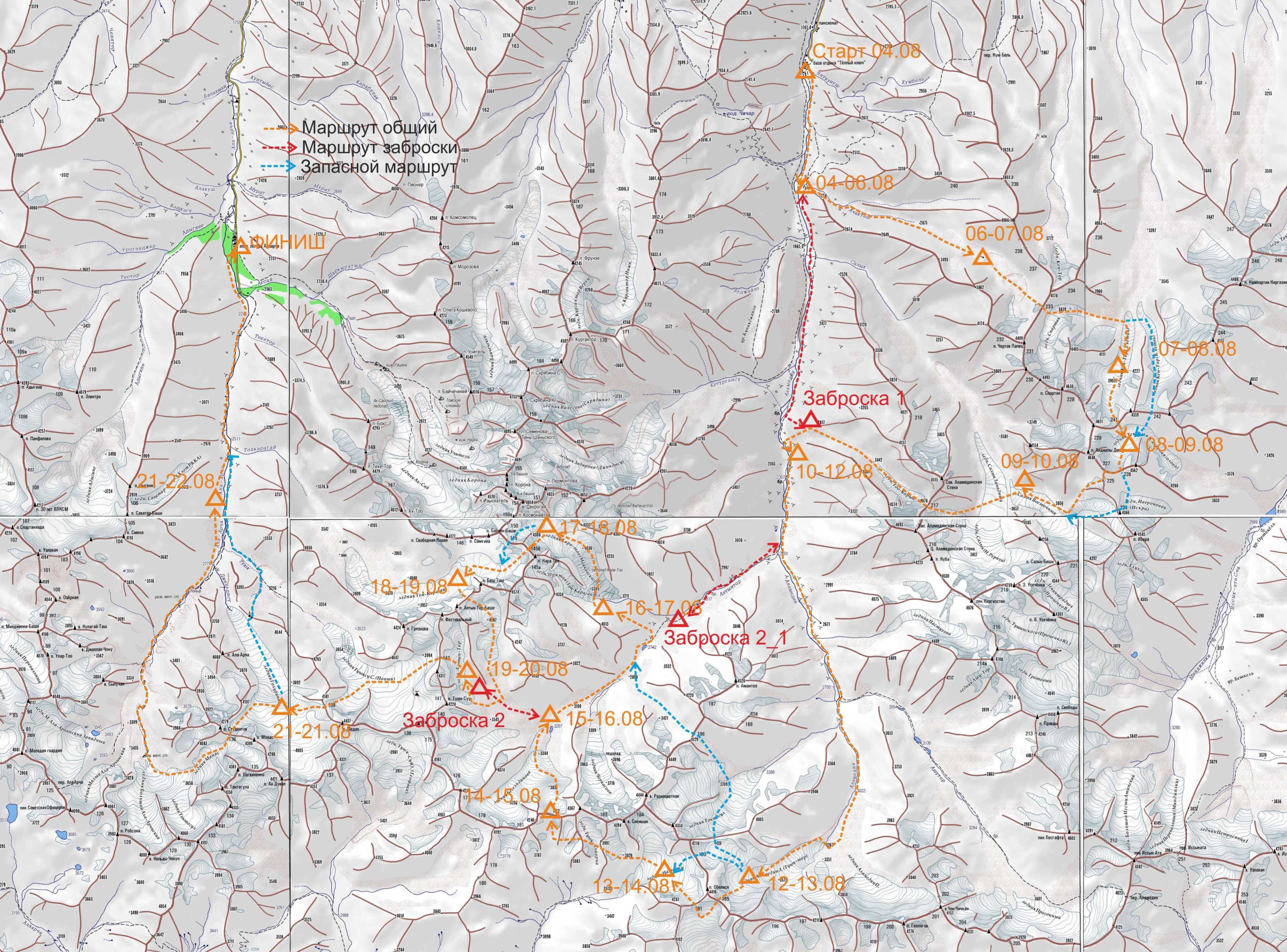Подробная нитка маршрута: Заявленная: т/б «Теплый ключ» - долина р. Ачикташ - пер. Чертов палец (1Б) - лед. Кен-Тор Зап. - пер. Людмилы Киселевой (2Б) - лед. Тековый. - связка пер. Искра Сев. (2Б), пер. Карнизный (2А) - лед. Салык Вост. - пер. Тоо-Карын (2Б) - долина р. Аламедин - лед. Аламедин Л. - связка пер. Физкультурников (2Б), пер. Ю.Глухова (2А) - лед. Наталии - траверс южного склона Главного Киргизского хребта до пер. Литва - пер. Литва (2Б) - долина р. Алтынтор - лед. Кара-тоо (Маяковского) - пер. Кара-тоо (2Б) - лед. Топ-Карагай - пер. Войтихова (2Б) - лед. Алтынтор - пер. Алтын-Тор-Ашу (1Б) - лед. Туюк-Су Сев. - пер. Медик (2А) - лед. Голубина - пер. Шестерых (1Б) - лед. Манас - а/л «Ала-Арча». Пройденная: т/б «Теплый ключ» - долина р. Ачикташ - пер. Чертов палец (1Б) - лед. Кен-Тор Зап. - пер. Людмилы Киселевой (2Б) - лед. Тековый. - пер. Искра Сев. (2Б) - пер. Карнизный (2А) - лед. Салык Вост. - долина р. Салык - долина р. Аламедин - лед. Аламедин Л. - пер. Туюк-Тор Зап. (Юрмала) (1Б) - пер. Ю.Глухова (2А, радиально) - лед. Наталии - траверс южного склона Главного Киргизского хребта до пер. Литва - пер. Литва (2Б) - долина р. Алтынтор - лед. Кара-тоо (Маяковского) - пер. Топ-Карагай (2Б) - лед. Топ-Карагай - пер. Войтихова (2Б) - лед. Алтынтор - пер. Алтын-Тор-Ашу (1Б) - лед. Туюк-Су Сев. - пер. Медик (2А) - лед. Голубина - пер. Шестерых (1Б) - лед. Манас - а/л «Ала-Арча». Приводим обзорные схемы маршрута: Схема. Маршрут заявленный Схема. Маршрут пройденный Определяющие препятствия маршрута: