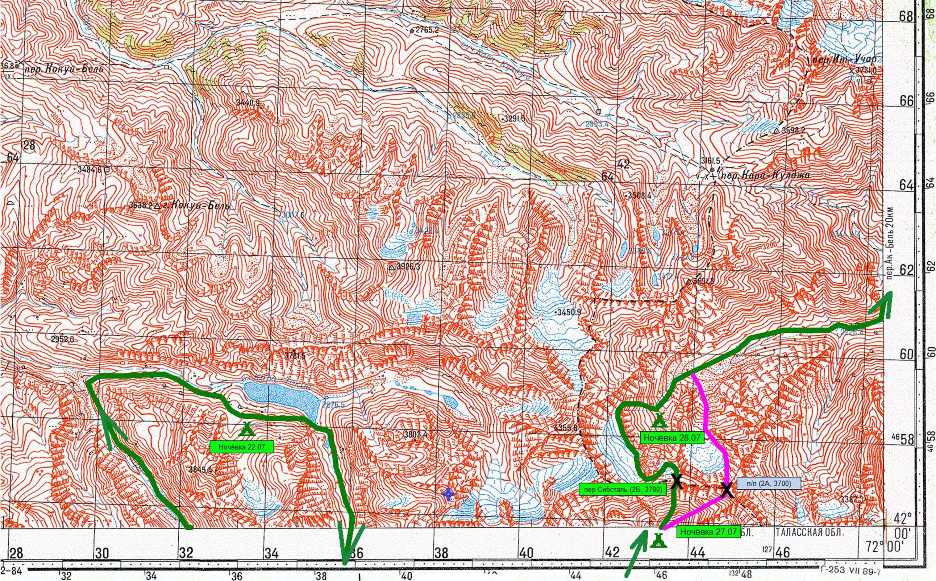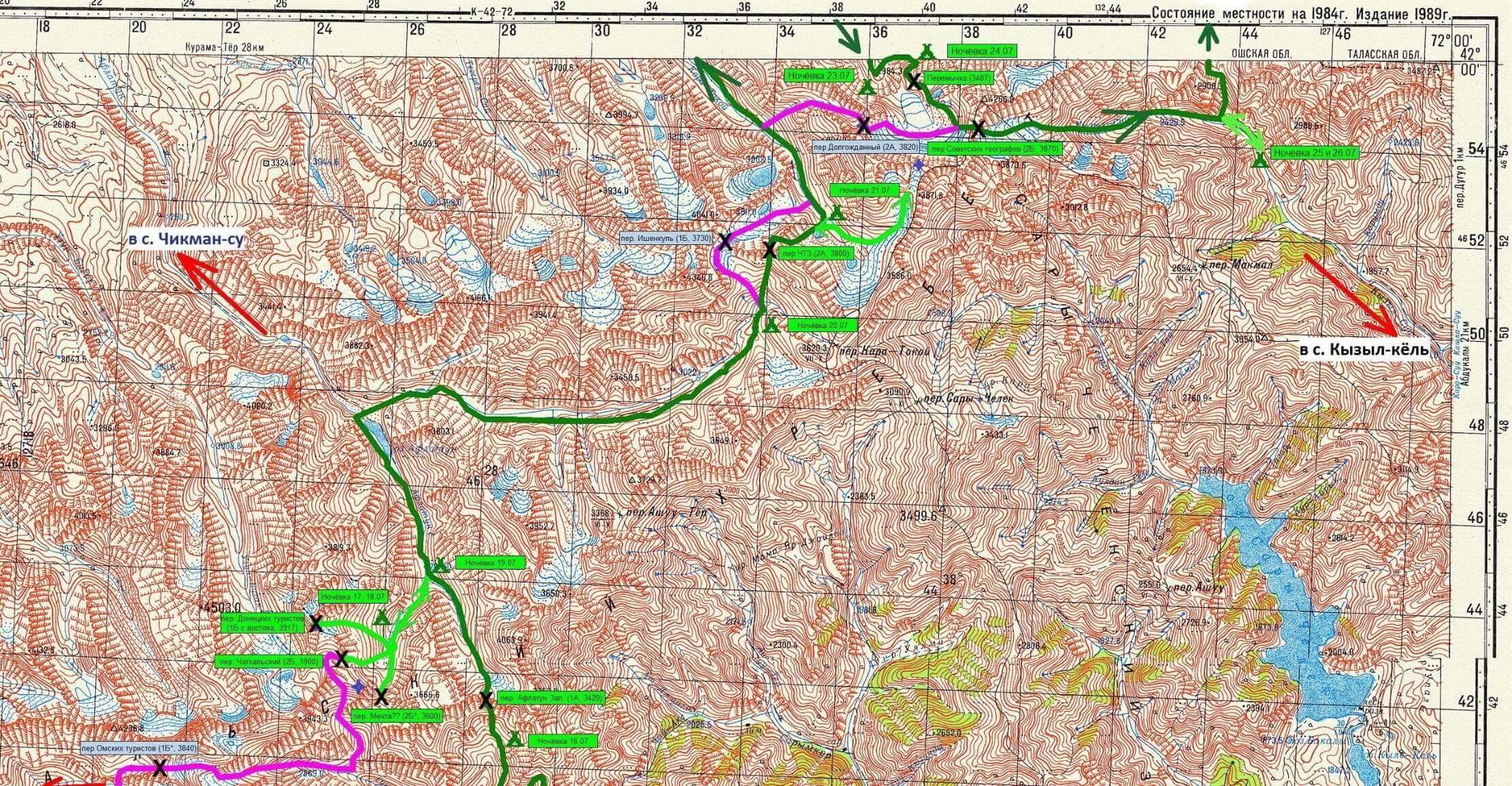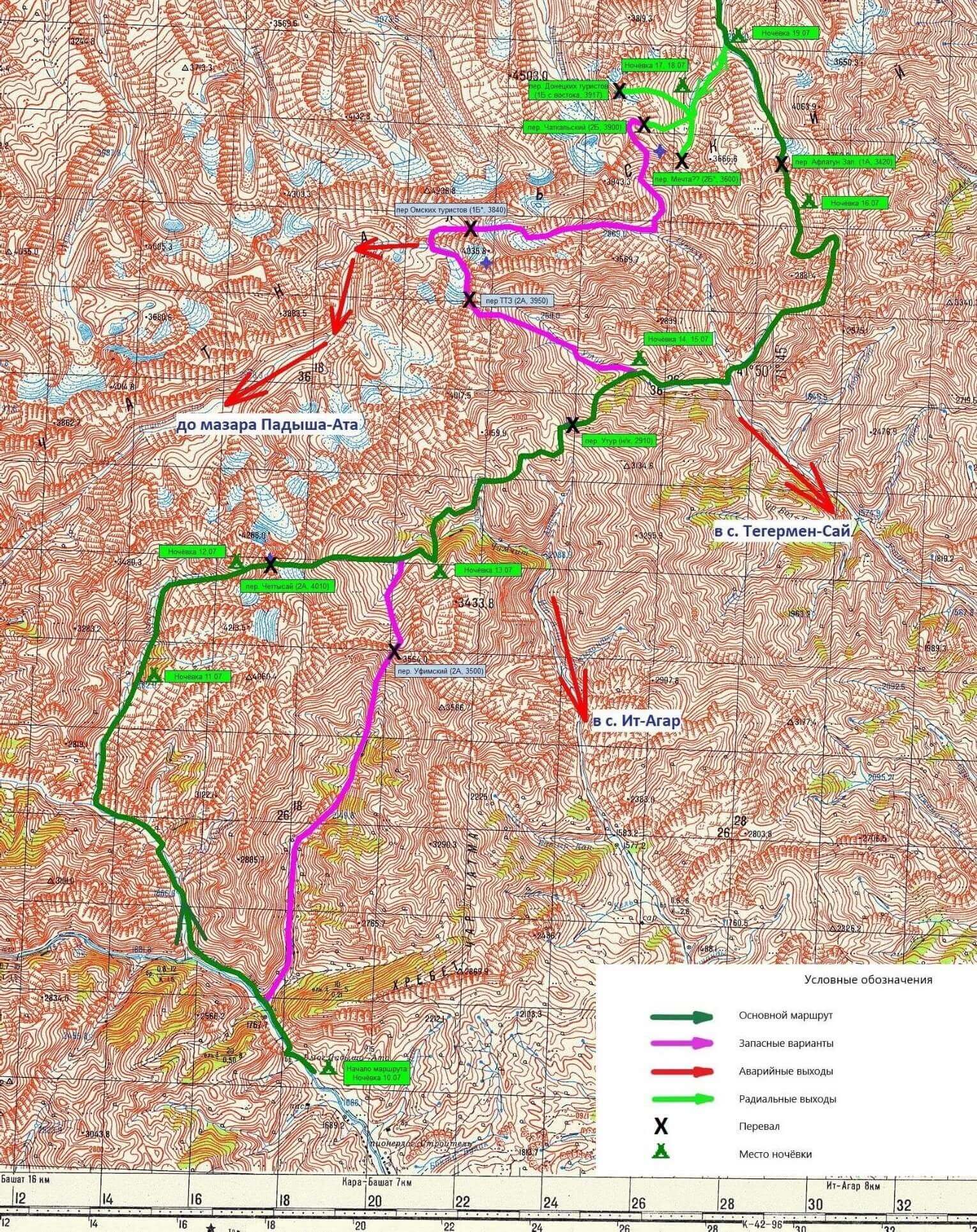 ТЕХНИЧЕСКОЕ ОПИСАНИЕ МАРШРУТА Техническое описание составлено в хронологическом порядке. Описание каждого участка выделено в отдельную часть, которая начинается с того участка, на котором закончилась предыдущая. Всюду в данном отчете определяющие слова "левая", "правая" имеют орографический смысл. А эти же слова, но с префиксами ("налево", "направо" и т.п.) употреблены в смысле "по ходу движения". Прохождение всех камнепадоопасных и технически сложных участков осуществлялось в касках. При прохождении всех перевалов 2А-2Б к. сл. группой применялось одно и то же командное снаряжение: основные веревки, 3х50 метров, карабины, скальные крючья, расходные куски основной веревки. Не пригодились: ледобуры. Каждый участник имел необходимый набор личного специального снаряжения: страховочную систему, карабины, ледоруб, каску, кошки, ледобуры, тормозное устройство, зажим и пр. Время движения указано общее, т.е. от выхода с места ночлега до прибытия к месту бивуака. Расстояние указали то, которое измерили по карте (в программе OziExplorer) и с учетом коэффициента 1,2. На фотографиях красной линией указан маршрут группы и направление движения, зелёным цветом показаны географические объекты. Для технического описания были использованы записи из походного диктофона и воспоминания участников и руководителя группы. В тексте даны ссылки на точки из Приложения Ж. Координаты GPS даны в стандарте WGS 84 в формате ХХгрYYминZZ,Z" (северной широты, восточной долготы). Перевал Четтысай Характеристика перевала. Номер по классификатору 8.72 Номер на схеме - хребтовке 97 Категория сложности 2А Высота по классификатору 4010 м Высота по GPS 3944 м Тип склона скально – осыпной Направление прохождения с запада на восток Координаты по GPS 41гр47мин23.0"северной широты 71гр36мин43.6" восточной долготы Расположен: в южном отроге Чаткальского хребта между вершинами 4268,0 на севере и 4213,5 на юге. Соединяет левый исток р. Четтысай (р. Падыша-Ата) и центральный исток р. Чимчит (р. Ит-Агар). Название: известно второе название перевала – Итагар. Первопрохождение: нет информации. Дальнейшая история прохождений: нет информации. Основные опасности: на скалах и осыпях возможно падение камней в весеннее время склоны могут быть лавиноопасны. Меры безопасности: постоянное наблюдение за камнепадоопасными склонами, движение по осыпи с самостраховкой, плотной группой и под углом к линии вертикали. С запада движение при необходимости со страховкой по перилам при прохождении скального пояса. С востока движение с перильной страховкой по снежнику и скалам. Участки, определяющие категорию сложности: подвижные осыпи с обеих сторон с запада скальный пояс, 35-40°, 150м, снежно-осыпной склон 35° с востока снежник 50 до40°, 50м, снежник и разрушенные скалы 40-30°, скалы 70°, 25м. Возможные места ночлега: на подъёме – осыпи перед скальным поясом. На спуске – травянистый склон после скального пояса и водопадов. Прохождение: 11,12,13-го июля 2018 г. Описание даётся от мазара Падыша-Ата до ущелья Чимчит. С перевала снята записка группы туристов, однако её не смогли прочитать даже реставраторы бумажных документов. Находилась на перевале в банке с водой. Погода во время прохождения:11-го с утра ясно, после обеда облачно, небольшой дождь 12-го с утра ясно, после обеда облачно 13-го ясно.11.07.18 г. К мазару Падыша-Ата (фото 001) мы приехали машиной накануне, после 