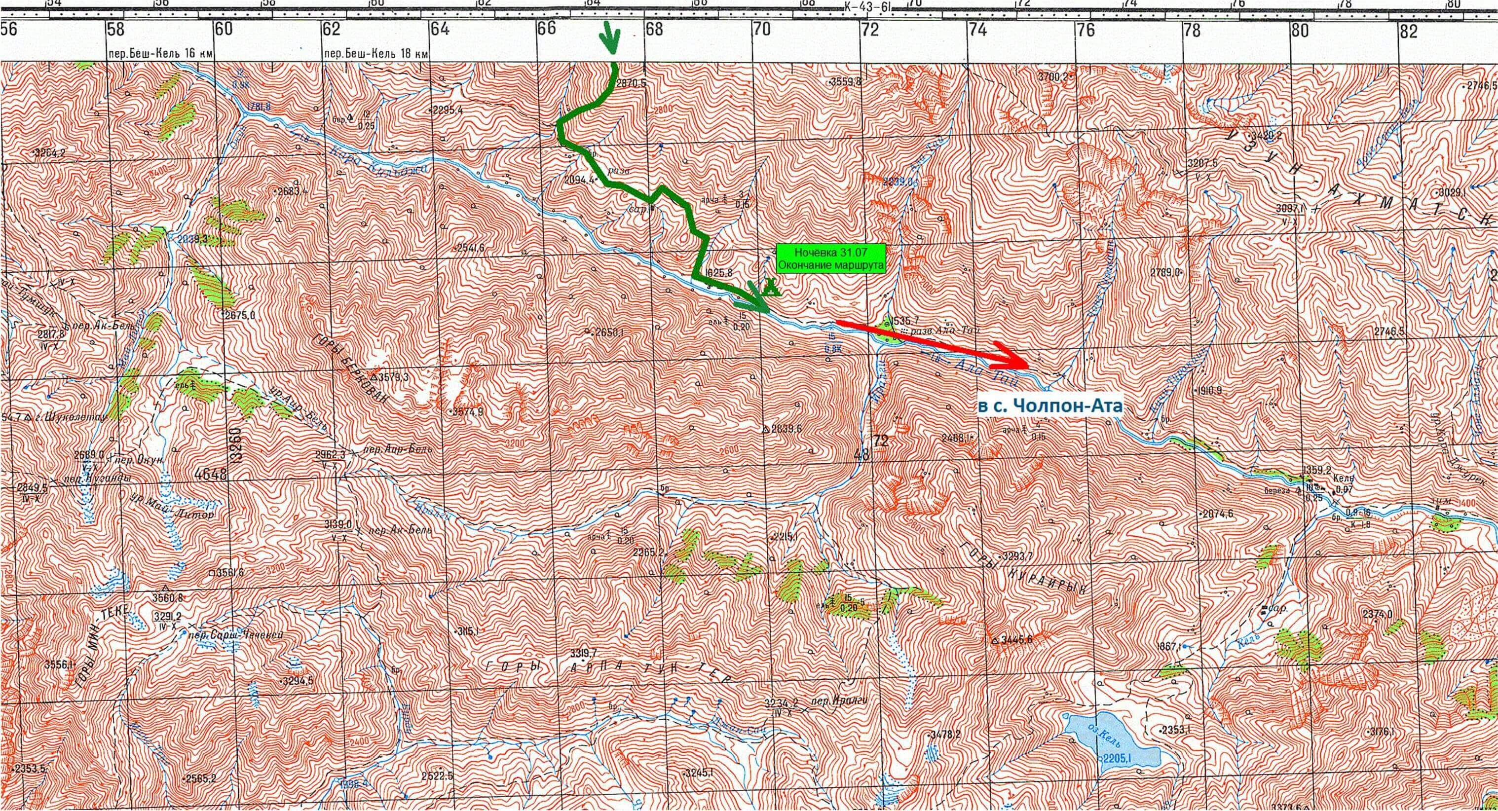 Фото 112. Ущелье Каратокой. Тропа идёт высоко (до 400 м) над рекой. Все еще жарко, говорят, что в этом году жара, какой не было уже лет 10. Тропа петляет по старым валам и отрогам. Они поросли травой, встречаются островки леса или чистых осыпей. По склонам разбросаны крупные валуны. 19:35 Пришли к месту ночёвки в ущ. Каратокой, точка 37. Травянисто- осыпной склон, высоко над западной оконечностью оз. Каратокой. Вода выше по склону из ручья, но далековато, 10 минут идти. Открытое ветреное место, но до более комфортных мест сегодня мы бы уже не дошли. Итого : общее время 11 часов 50 минут протяженность 15,8км перепад высот 3384 м – 2580 м –3028 м -804 м +448 м Продолжение. Часть 2 здесь |