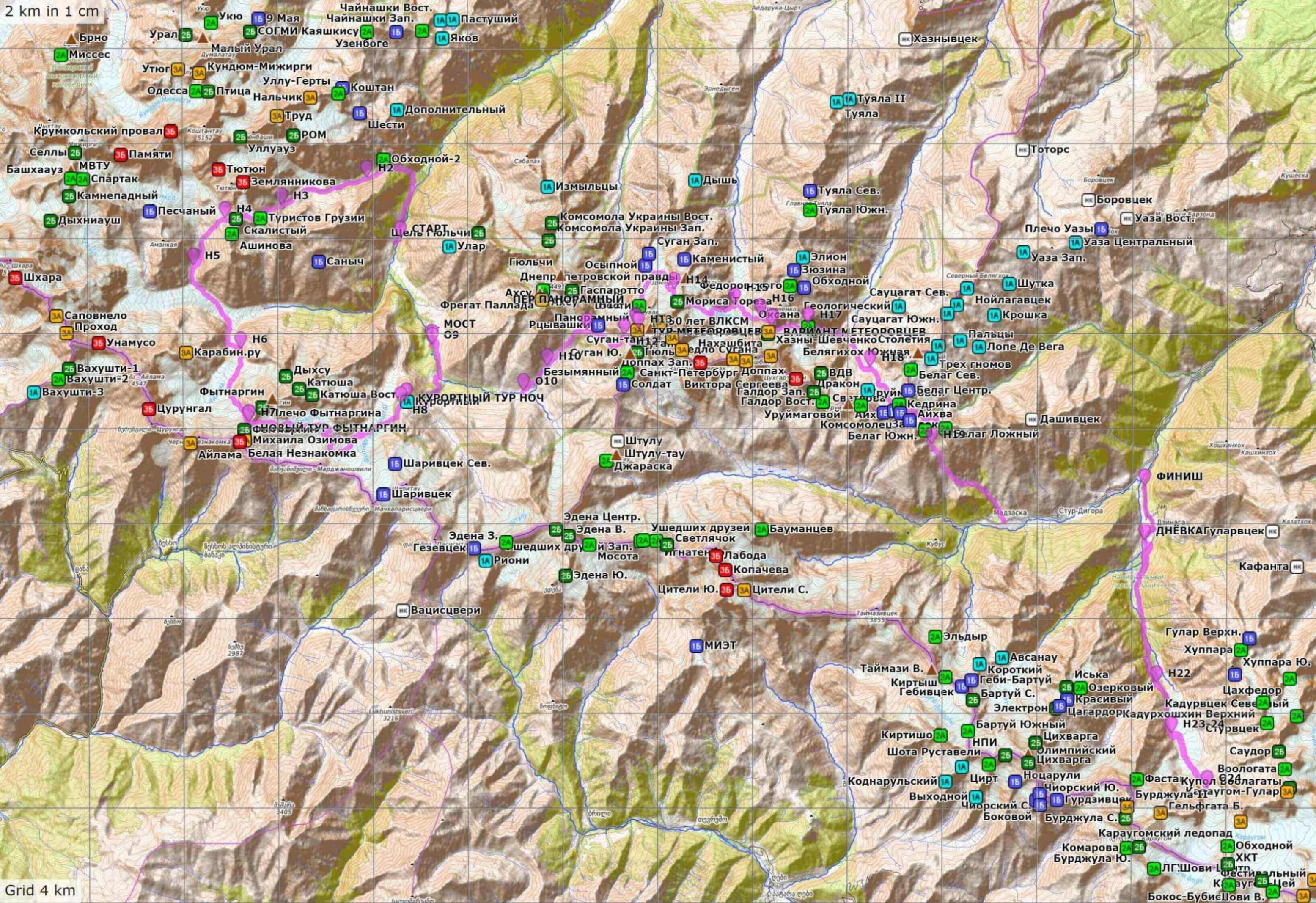 Нитка маршрута: р. Тютюнсу - пер. Туристов Грузии+пер. Скалистый (2Б) - пер. Фытнаргин (3А) - пер. Курортный (1А) - пер. Панорамный (3А)+пер. Шести - пер. Мориса Тореза (2Б) - пер. Хазны-Метеоровцев+пер. Оксана (3А) - пер. Кедрина (2А) - пер. Ю.Белаг (1Б) - Караугомский ледопад (рад. до 2950, 2А)